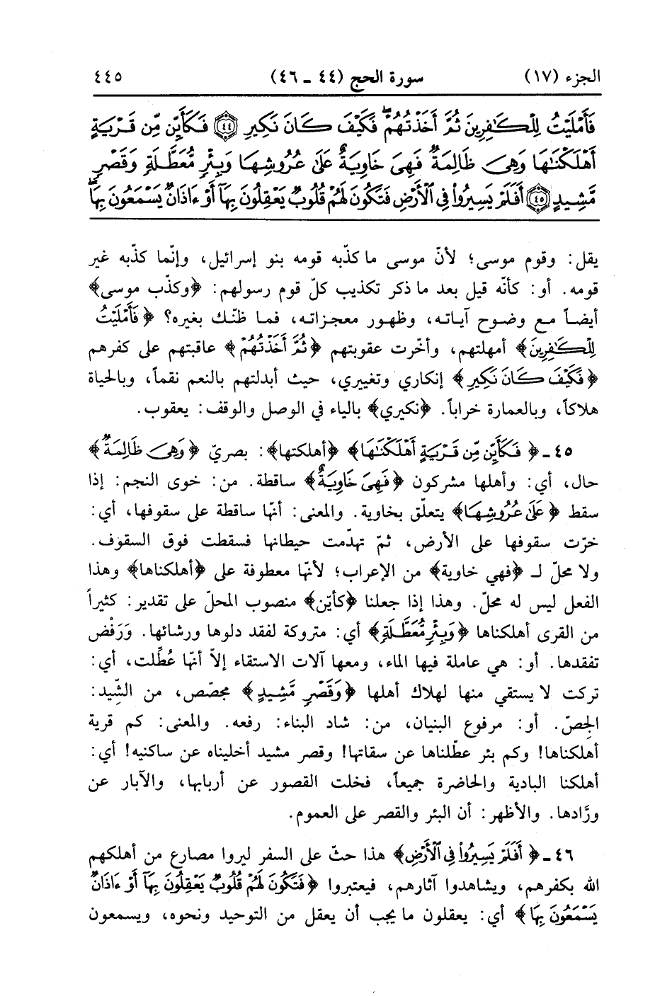 فَكَأَيِّنْ مِنْ قَرْيَةٍ أَهْلَكْنَاهَا وَهِيَ ظَالِمَةٌ فَهِيَ خَاوِيَةٌ عَلَى عُرُوشِهَا وَبِئْرٍ مُعَطَّلَةٍ وَقَصْرٍ مَشِيدٍ (45)