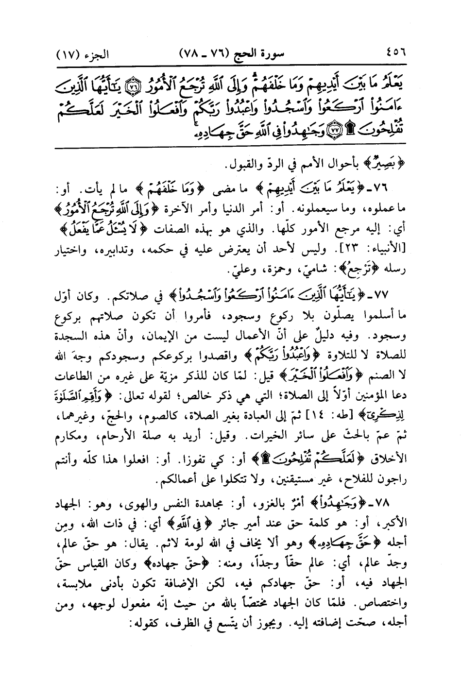 وَجَاهِدُوا فِي اللَّهِ حَقَّ جِهَادِهِ هُوَ اجْتَبَاكُمْ وَمَا جَعَلَ عَلَيْكُمْ فِي الدِّينِ مِنْ حَرَجٍ مِلَّةَ أَبِيكُمْ إِبْرَاهِيمَ هُوَ سَمَّاكُمُ الْمُسْلِمِينَ مِنْ قَبْلُ وَفِي هَذَا لِيَكُونَ الرَّسُولُ شَهِيدًا عَلَيْكُمْ وَتَكُونُوا شُهَدَاءَ عَلَى النَّاسِ فَأَقِيمُوا الصَّلَاةَ وَآتُوا الزَّكَاةَ وَاعْتَصِمُوا بِاللَّهِ هُوَ مَوْلَاكُمْ فَنِعْمَ الْمَوْلَى وَنِعْمَ النَّصِيرُ (78)