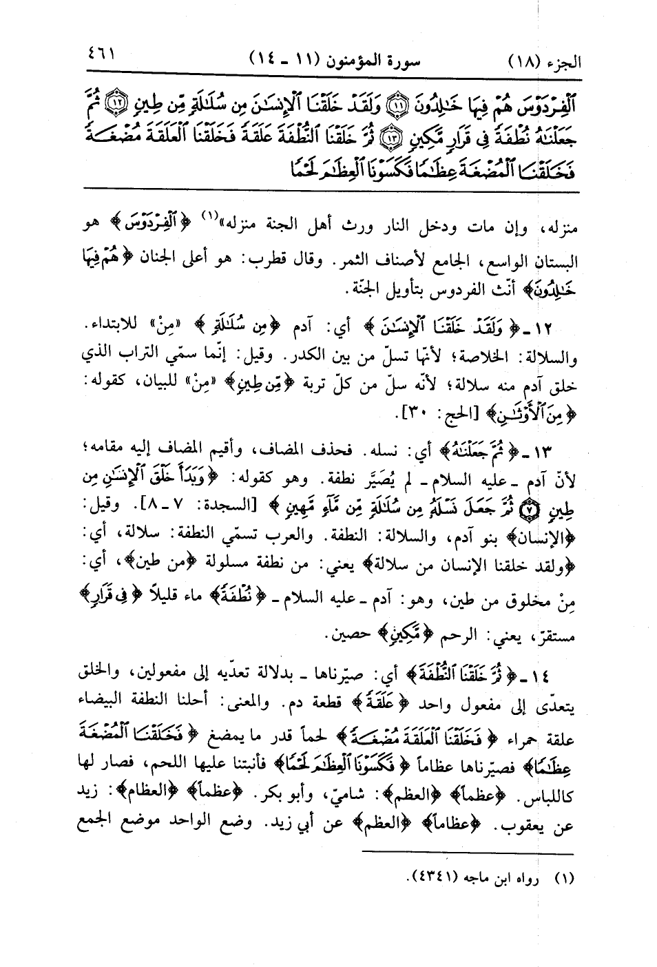 ثُمَّ خَلَقْنَا النُّطْفَةَ عَلَقَةً فَخَلَقْنَا الْعَلَقَةَ مُضْغَةً فَخَلَقْنَا الْمُضْغَةَ عِظَامًا فَكَسَوْنَا الْعِظَامَ لَحْمًا ثُمَّ أَنْشَأْنَاهُ خَلْقًا آخَرَ فَتَبَارَكَ اللَّهُ أَحْسَنُ الْخَالِقِينَ (14)