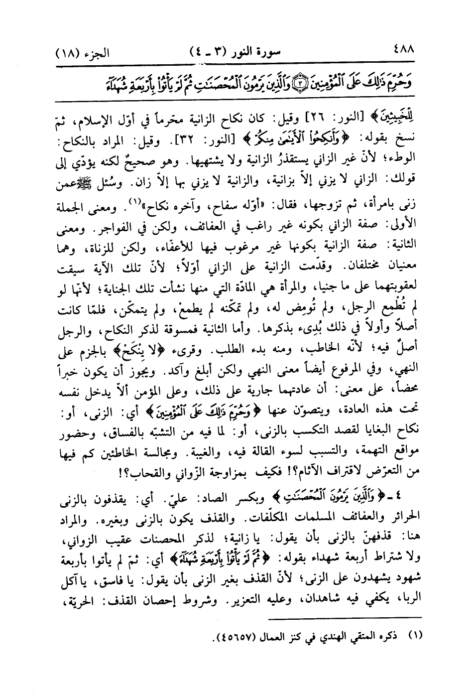 {والذين يَرْمُونَ المحصنات} وبكسر الصاد علي أي يقذفون بالزنا الحرائر والعفائف المسلمات المكلفات والقذف يكون بالزنا وبغيره والمراد هنا قذفهن بالزنا بأن يقول يا زانية لذكر المحصنات عقيب الزواني ولاشتراط أربعة شهداء بقوله {ثُمَّ لَمْ يَأْتُواْ بِأَرْبَعَةِ شُهَدَاء} أي ثم لم يأتوا بأربعة شهود يشهدون على الزنا لأن القذف بغير الزنا بأن يقول يا فاسق يا آكل الربا يكفي فيه شاهدان وعليه التعزير وشروط إحصان القذف الحرية