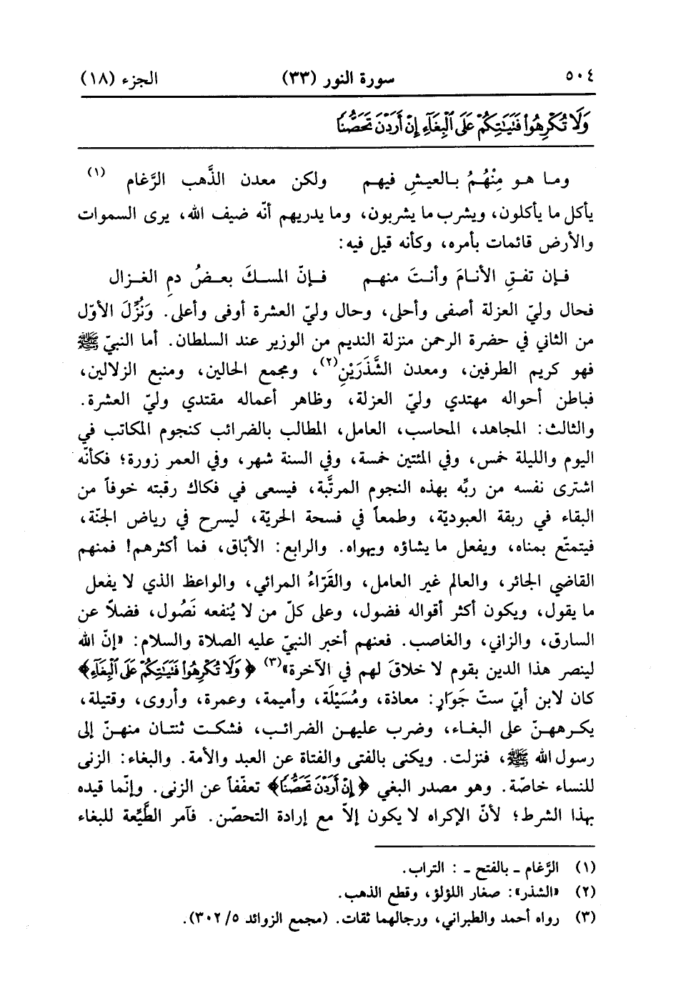 فحال ولي العزلة أصفى وأحلى وحال ولى العشرة أو فى وأعلى ونزل الأول من الثاني في حضرة الرحمن منزلة النديم من الوزير عند السلطان أما النبى عليه الصلاة والسلام فهو كريم الطرفين ومعدن الشذرين ومجمع الحالين ومنبع الزلالين فباطن أحواله مهتدي ولي العزلة وظاهر أعماله مقتدى ولي العشرة والثالث المجاهد المحاسب العامل المطالب بالضرائب كنجوم المكاتب عليه فى اليوم والليلة خمس وفى المائتين درهما خمسة وفي السنة شهر وفي العمر زورة فكأنه اشترى نفسه من ربه بهذه النجوم المرتبة فيسعى في فكاك رقبته خوفاً من البقاء في ربقة العبودية وطمعاً في فتح باب الحرية ليسرح في رياض الجنة فيتمتع بمبياه ويفعل ما يشاؤه ويهواه والرابع الإباق فما أكثرهم فمنهم القاضى الجائر والعالم غير العامل والعامل المرائي والواعظ الذي لا يفعل ما يقول ويكون أكثر أقواله الفضول وعلى كل ما لا ينفعه يصول فضلا عن السارق والزاني والغاصب فعنهم أخبر النبي عليه الصلاة والسلام ان الله لينصر هذا الدين بقوم لاخلاق لهم في الآخرة {وَلاَ تُكْرِهُواْ فتياتكم عَلَى البغاء} كان لابن أبيّ ست جوار معاذة ومسكية وأميمة وعمرة وأروى وقتيلة يكرههن على البغاء وضرب عليهم الضرائب فشكت ثنتان منهن إلى رسول الله عليه الصلاة والسلام فنزلت ويكنى بالفتى والفتاة عن العبد والأمة والبغاء الزنا للنساء خاصة وهو مصدر لبغت {إِنْ أَرَدْنَ تَحَصُّناً} تعففاً عن الزنا وإنما قيده بهذا الشرط لأن الإكراه لا يكون الامع إرادة التحصن فآمر المطيعة للبغاء