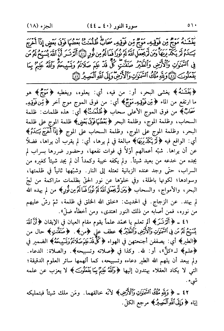 أَلَمْ تَرَ أَنَّ اللَّهَ يُسَبِّحُ لَهُ مَنْ فِي السَّمَاوَاتِ وَالْأَرْضِ وَالطَّيْرُ صَافَّاتٍ كُلٌّ قَدْ عَلِمَ صَلَاتَهُ وَتَسْبِيحَهُ وَاللَّهُ عَلِيمٌ بِمَا يَفْعَلُونَ (41)
