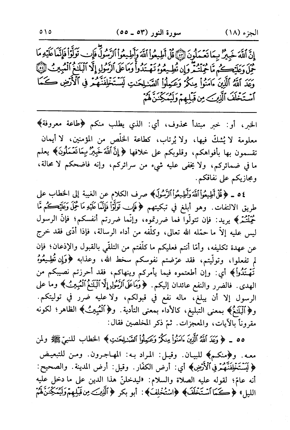 قُلْ أَطِيعُوا اللَّهَ وَأَطِيعُوا الرَّسُولَ فَإِنْ تَوَلَّوْا فَإِنَّمَا عَلَيْهِ مَا حُمِّلَ وَعَلَيْكُمْ مَا حُمِّلْتُمْ وَإِنْ تُطِيعُوهُ تَهْتَدُوا وَمَا عَلَى الرَّسُولِ إِلَّا الْبَلَاغُ الْمُبِينُ (54)