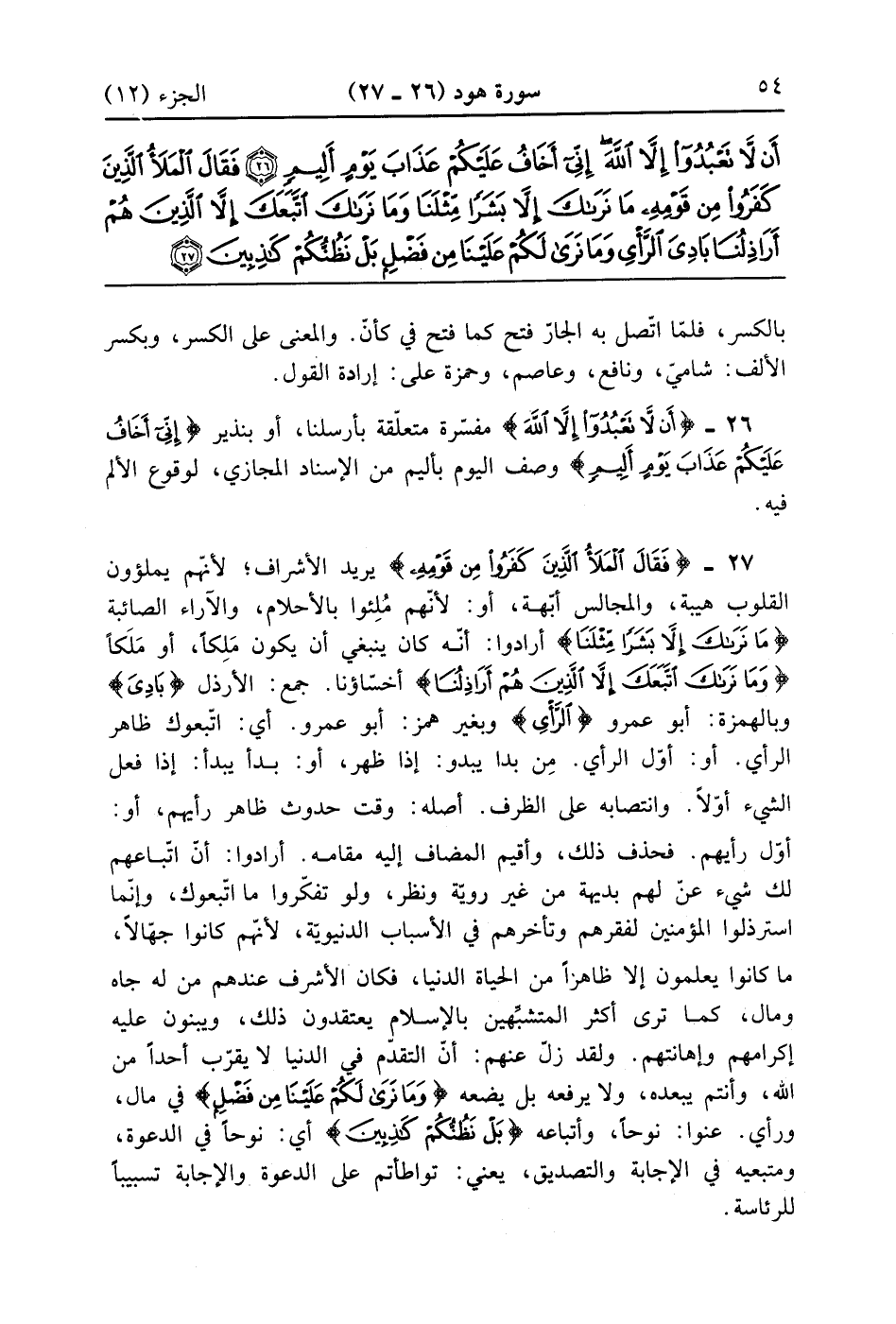 فَقَالَ الْمَلَأُ الَّذِينَ كَفَرُوا مِنْ قَوْمِهِ مَا نَرَاكَ إِلَّا بَشَرًا مِثْلَنَا وَمَا نَرَاكَ اتَّبَعَكَ إِلَّا الَّذِينَ هُمْ أَرَاذِلُنَا بَادِيَ الرَّأْيِ وَمَا نَرَى لَكُمْ عَلَيْنَا مِنْ فَضْلٍ بَلْ نَظُنُّكُمْ كَاذِبِينَ (27)