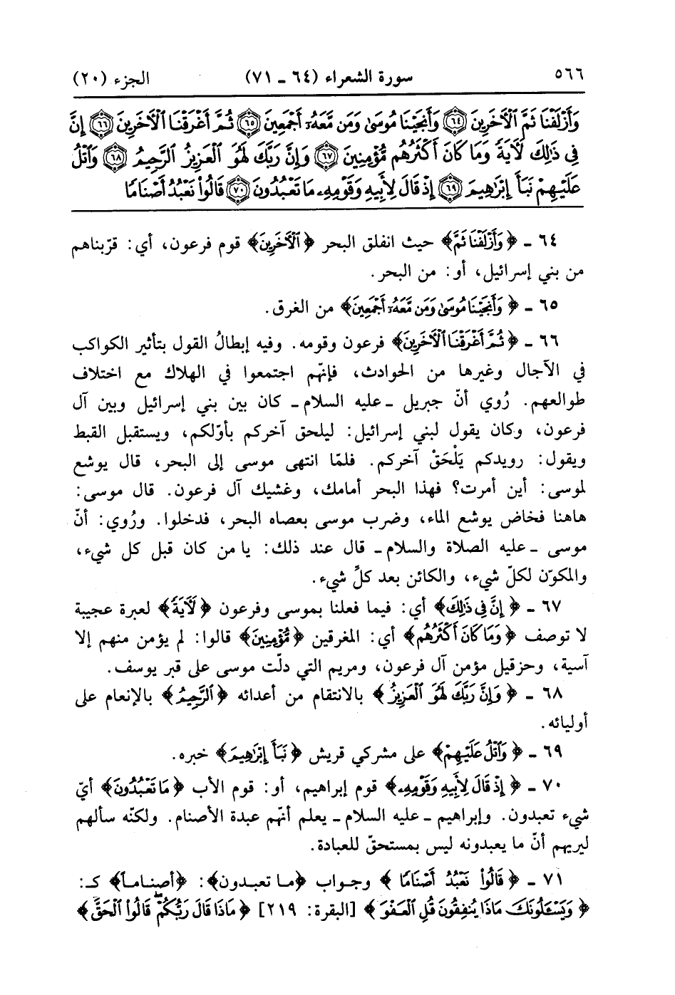 {ثُمَّ أَغْرَقْنَا الآخرين} فرعون وقومه وفيه إبطال القول بتأثير الكواكب في الآجال وغيرها من الحوادث فإنهم اجتمعوا في الهلاك مع اختلاف طوالعهم روي أن جبريل عليه السلام كان بين بني إسرائيل وبين آل فرعون فكان يقول لبني إسرائيل ليلحق آخركم بأولكم ويستقبل القبط فيقول رويدكم يلحق آخركم بأولكم فلما انتهى موسى إلى البحر قال يوشع لموسى أين أمرت فهذا البحر أمامك وغشيك آل فرعون قال موسى ههنا فخاض يوشع الماء وضرب موسى بعصاه البحر فدخلوا وروي أن موسى عليه الصلاة والسلام قال عند ذلك يا من كان قبل كل شئ والمكون لكل شئ والكائن بعد كل شئ