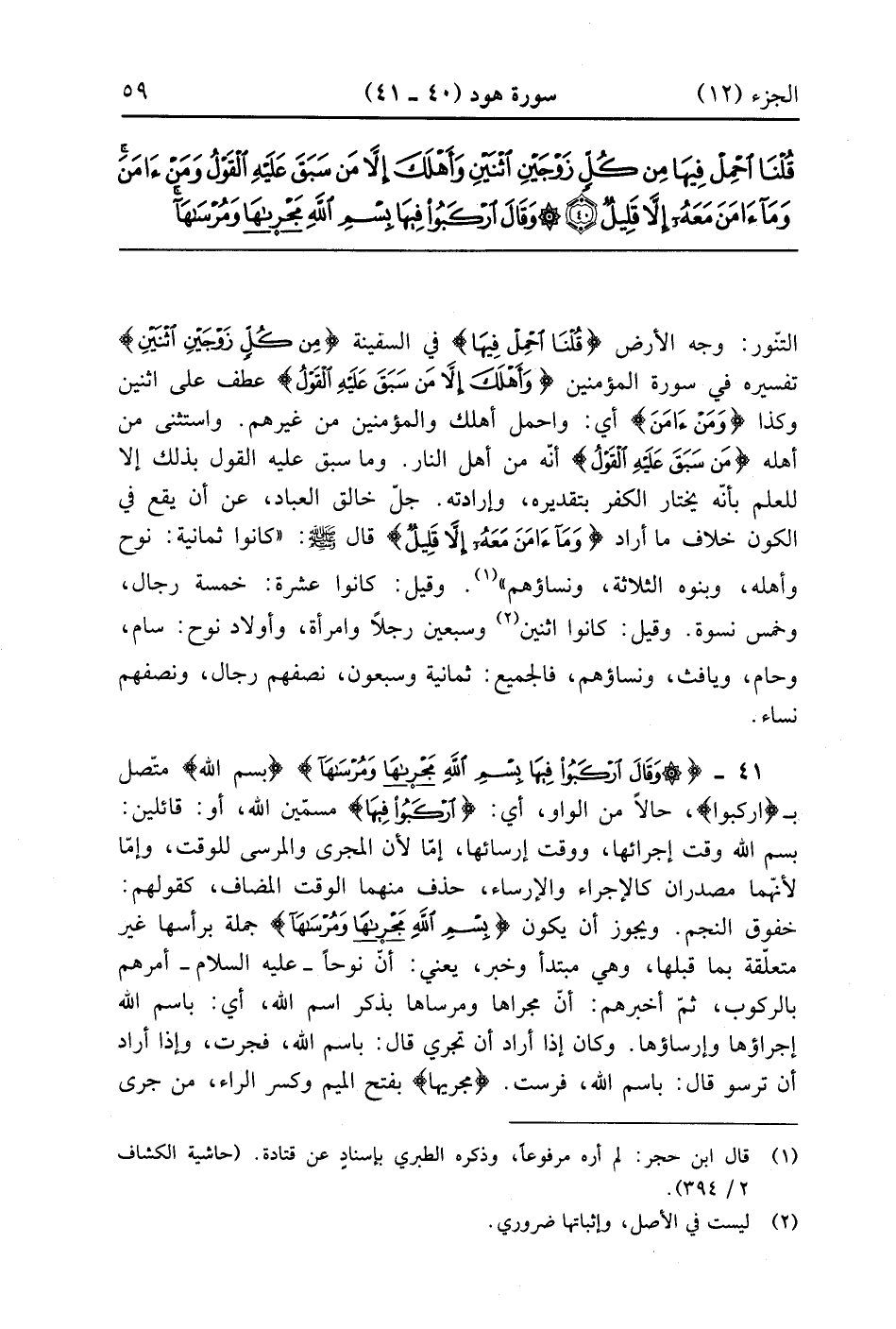 التنور وجه الأرض {قُلْنَا احمل فِيهَا} في السفينة {مِن كل زوجين اثنين} تفسيره فى سورة ا 4 لمؤمنين {وَأَهْلَكَ إِلاَّ مَن سَبَقَ عَلَيْهِ القول} عطف على اثنين وكذا {ومن آمن} أي واحمل أهلك والمؤمنين من غيرهم واستثنى من أهله من سبق عليه القول إنه من أهل النار وما سبق عليه القول بذلك إلا للعلم بأنه يختار الكفر بتقديره وإرادته جل خالق العباد عن أن يقع فى الكون خلاف ما أراد {وما آمن مَعَهُ إِلاَّ قَلِيلٌ} قال عليه السلام كانوا ثمانية نوح وأهله وبنوه الثلاثة ونساؤهم وقيل كانوا عشرة خمسة رجال وخمس نسوة وقيل كانوا اثنين وسبعين رجالاً ونساء وأولاد نوح سام وحام ويافث ونساؤهم فالجميع ثمانية وسبعون نصفهم رجال ونصفهم نساء
