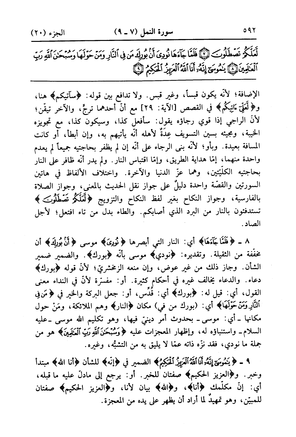 فَلَمَّا جَاءَهَا نُودِيَ أَنْ بُورِكَ مَنْ فِي النَّارِ وَمَنْ حَوْلَهَا وَسُبْحَانَ اللَّهِ رَبِّ الْعَالَمِينَ (8)