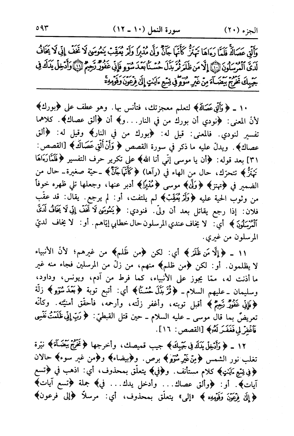 وَأَلْقِ عَصَاكَ فَلَمَّا رَآهَا تَهْتَزُّ كَأَنَّهَا جَانٌّ وَلَّى مُدْبِرًا وَلَمْ يُعَقِّبْ يَا مُوسَى لَا تَخَفْ إِنِّي لَا يَخَافُ لَدَيَّ الْمُرْسَلُونَ (10)