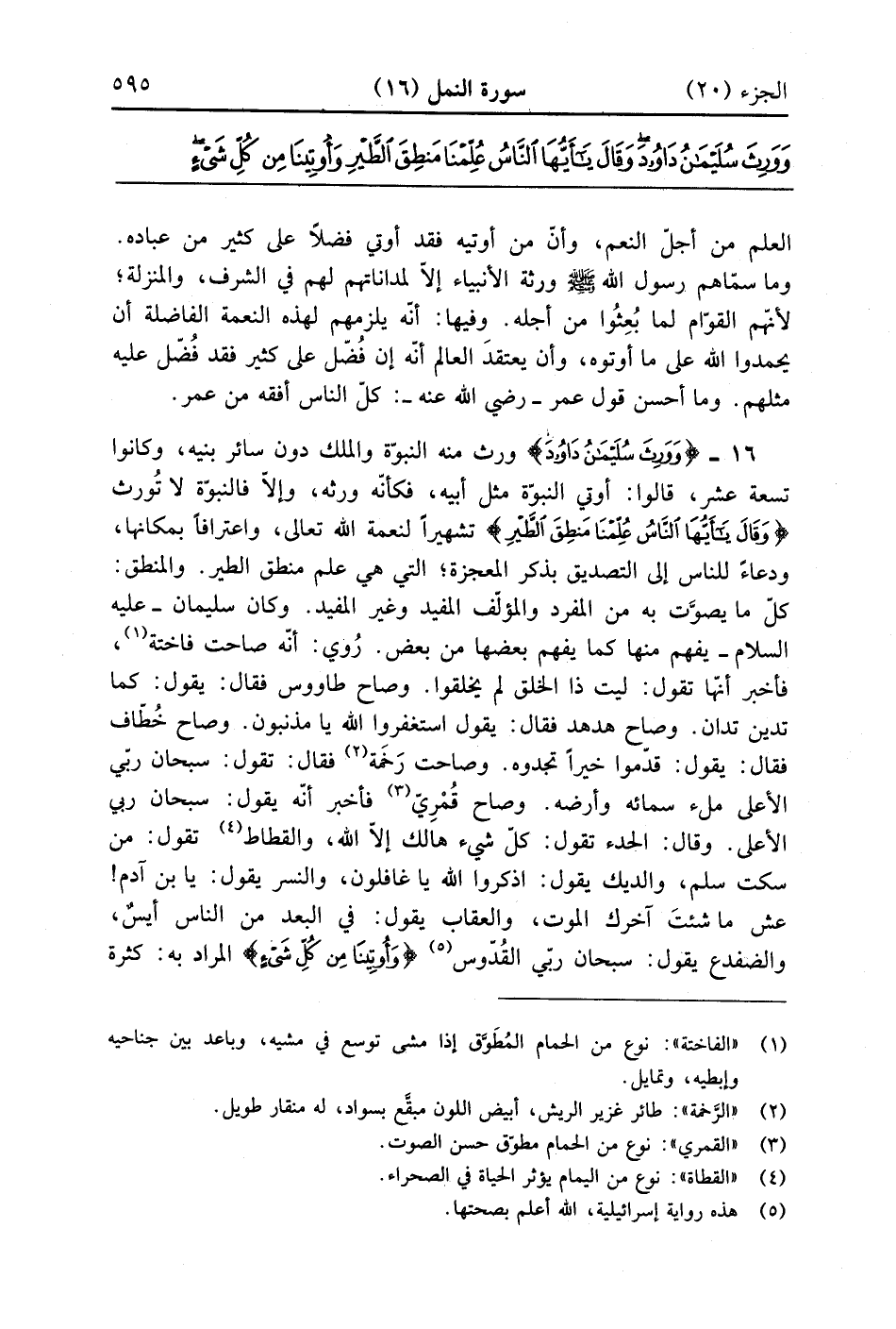 وَوَرِثَ سُلَيْمَانُ دَاوُودَ وَقَالَ يَا أَيُّهَا النَّاسُ عُلِّمْنَا مَنْطِقَ الطَّيْرِ وَأُوتِينَا مِنْ كُلِّ شَيْءٍ إِنَّ هَذَا لَهُوَ الْفَضْلُ الْمُبِينُ (16)