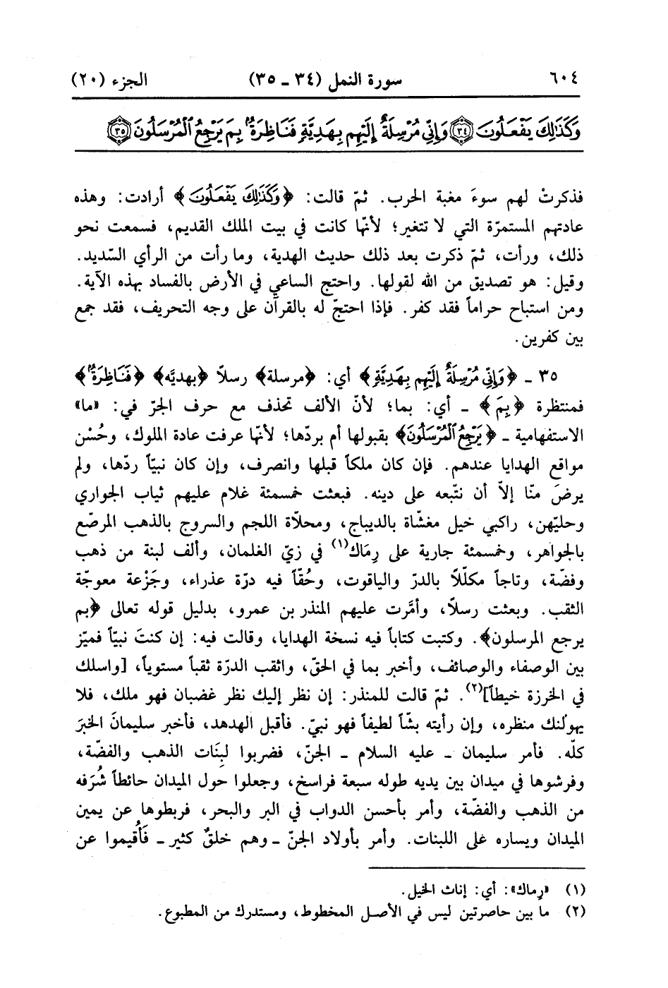 تحذف مع حرف الجر في الاستفهام {يرجع المرسلون} بقبولها أم بردها لأنها عرفت عادة الملوك وحسن مواقع الهدايا عندهم فإن كان ملكا فبلها وانصرف وإن كان نبياً ردها ولم يرض منا إلا أن نتبعه على دينه فبعثت خمسمائة غلام عليهم ثياب الجواري وحليهن راكبي خيل مغشاة بالديباج محلاة اللجم والسروج بالذهب المرصع بالجواهر وخمسمائة جارية على رماك في زي الغلمان وألف لبنة من ذهب وفضة وتاجا مكللا بالدر والياقوت وحقافية درة عذراء وجزعة معوجة الثقب وبعثت رسلاً وأمرت عليهم المنذر بن عمرو بدليل قوله تعالى بم يرجع المرسلون وكتبت كتابا في نسخة الهدايا وقالت فيه إن كنت نبياً فميز بين الوصفاء والوصائف وأخبر بما في الحق واثقب الدرة ثقباً واسلك في الخرزة خيطاً ثم قالت للمنذر إن نظر إليك نظر غضبان فهو ملك فلا يهولنك منظره وإن رأيته بشاشاً لطيفاً فهو نبي فأقبل الهدهد وأخبر سليمان الخبر كله فأمر سليمان الجن فضربوا لبنات الذهب والفضة وفرشوها في ميدان بين يديه طوله سبعة فراسخ وجعلوا حول الميدان حائطاً شرفه من الذهب والفضة وأمر بأحسن الدواب في البر والبحر فربطوها عن يمين الميدان ويساره على اللبنات وأمر بأولاد الجن وهم خلق كثير فأقيموا عن