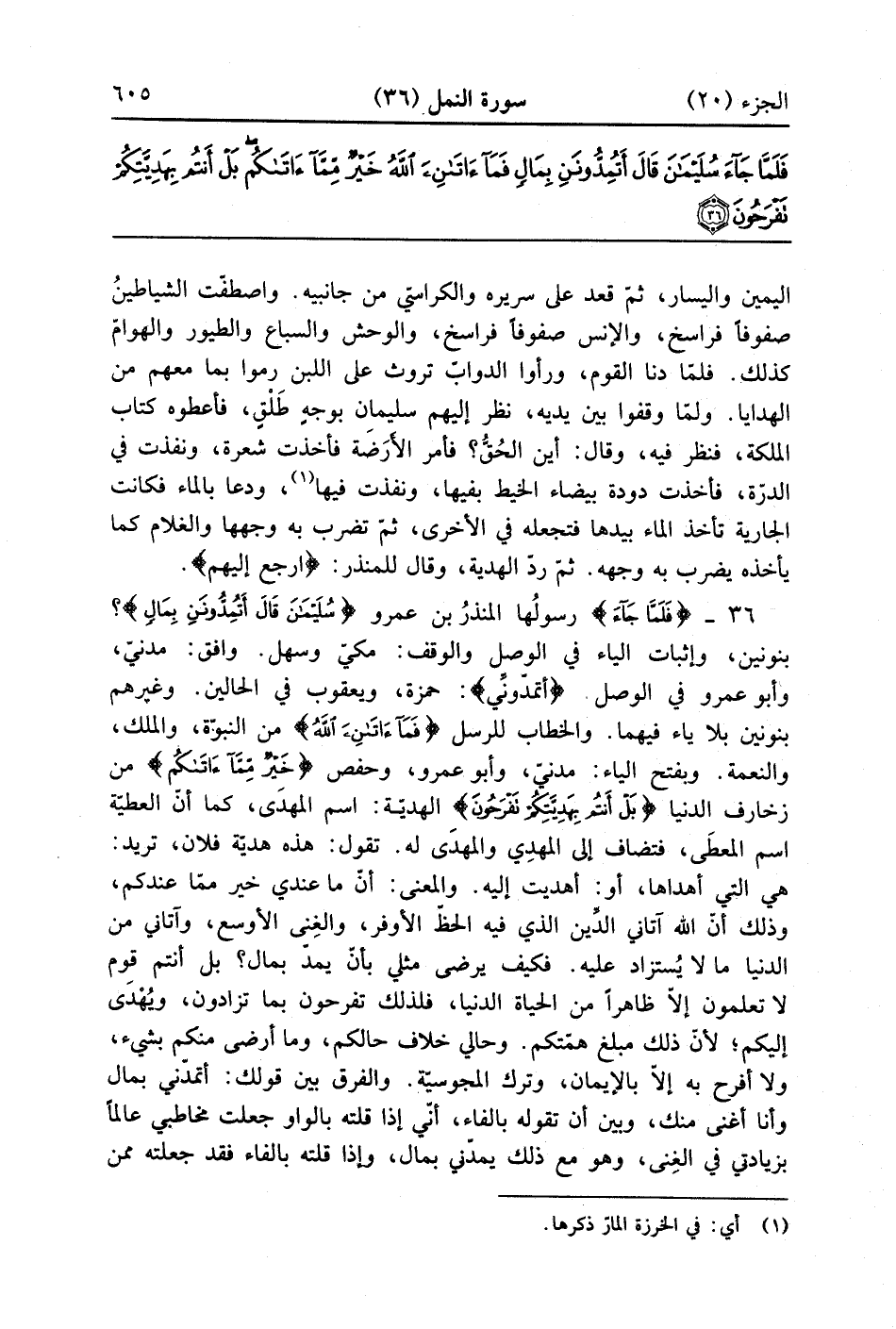 فَلَمَّا جَاءَ سُلَيْمَانَ قَالَ أَتُمِدُّونَنِ بِمَالٍ فَمَا آتَانِيَ اللَّهُ خَيْرٌ مِمَّا آتَاكُمْ بَلْ أَنْتُمْ بِهَدِيَّتِكُمْ تَفْرَحُونَ (36)