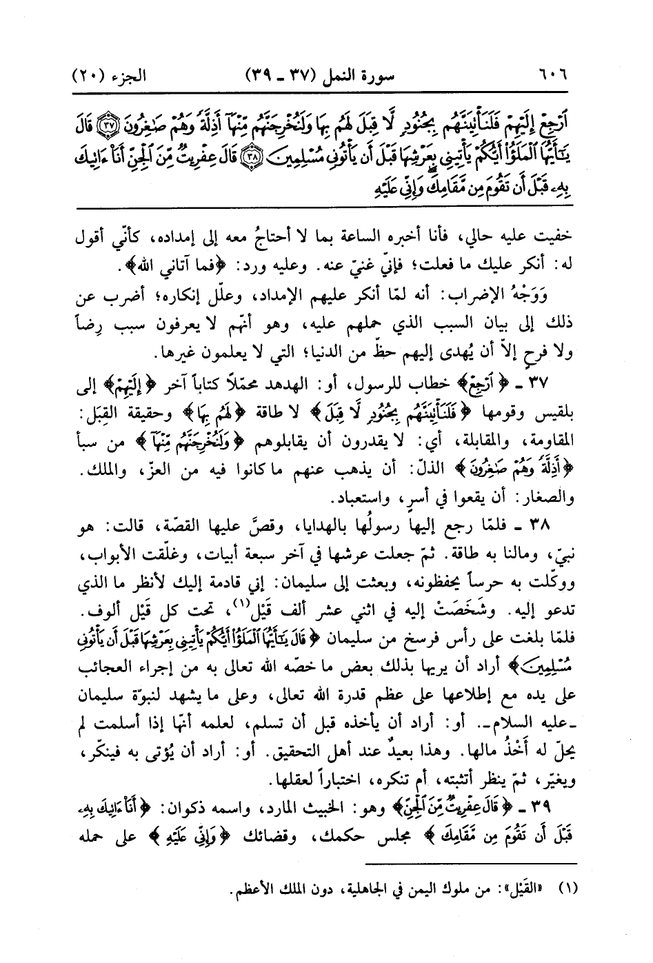 قَالَ عِفْرِيتٌ مِنَ الْجِنِّ أَنَا آتِيكَ بِهِ قَبْلَ أَنْ تَقُومَ مِنْ مَقَامِكَ وَإِنِّي عَلَيْهِ لَقَوِيٌّ أَمِينٌ (39)