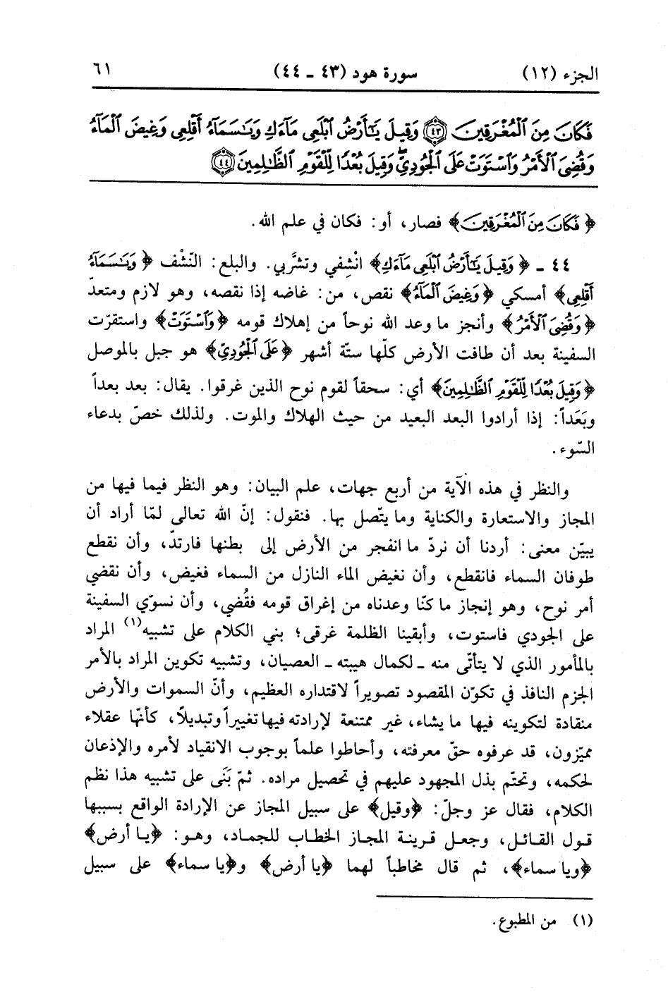وَقِيلَ يَا أَرْضُ ابْلَعِي مَاءَكِ وَيَا سَمَاءُ أَقْلِعِي وَغِيضَ الْمَاءُ وَقُضِيَ الْأَمْرُ وَاسْتَوَتْ عَلَى الْجُودِيِّ وَقِيلَ بُعْدًا لِلْقَوْمِ الظَّالِمِينَ (44)