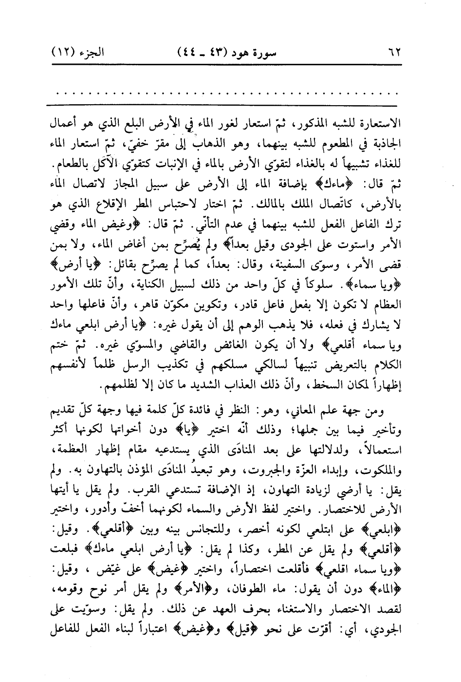 الاستعارة للشبه المذكور ثم استعار لغور الماء في الأرض البلع الذي هو أعمال الجاذبة في المطعوم للشبه بينهما وهو الذهاب إلى مقر خفي ثم استعار الماء للغذاء تشبيهاً له بالغذاء لتقوى الأرض بالماء في الإنبات كتقوي الآكل بالطعام ثم قال ماءك بإضافة الماء إلى الأرض على سبيل المجاز لاتصال الماء بالأرض كاتصال الملك بالمالك ثم اختار لاحتباس المطر الإقلاع الذي هو ترك الفاعل الفعل للشبه بينهما في عدم التأني ثم قال وغيض الماء وقضي الأمر واستوت على الجودي وقيل بعدا ولم يصرح بمن غاض الماء ولا بمن قضى الأمر وسوى السفينة وقال بعداً كما لم يصرح بقائل يا أرض ويا سماء سلوكا في كل واحد من ذلك لسبيل الكناية وأن تلك الأمور العظام لا تكون إلا بفعل فاعل قادر وتكوين مكون قاهر وأن فاعلها واحد لا يشارك في فعله فلا يذهب الوهم إلى أن يقول غيره ياء أرض ابلعي ماءك ويا سماء أقلعي ولا أن يكون الغائض والقاضي والمسوي غيره ثم ختم الكلام بالتعريض تنبيها لسالكى مسلكههم في تكذيب الرسل ظلماً لأنفسهم إظهاراً لمكان السخط وأن ذلك العذاب الشديد ما كان إلا لظلمهم ومن جهة علم المعاني