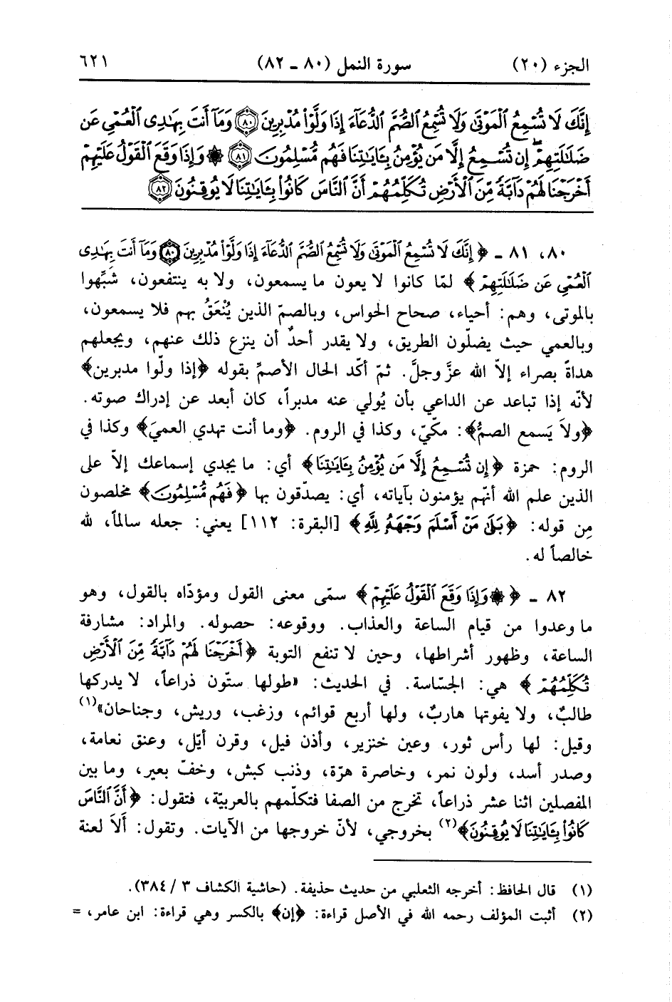 إِنَّكَ لَا تُسْمِعُ الْمَوْتَى وَلَا تُسْمِعُ الصُّمَّ الدُّعَاءَ إِذَا وَلَّوْا مُدْبِرِينَ (80) وَمَا أَنْتَ بِهَادِي الْعُمْيِ عَنْ ضَلَالَتِهِمْ إِنْ تُسْمِعُ إِلَّا مَنْ يُؤْمِنُ بِآيَاتِنَا فَهُمْ مُسْلِمُونَ (81)