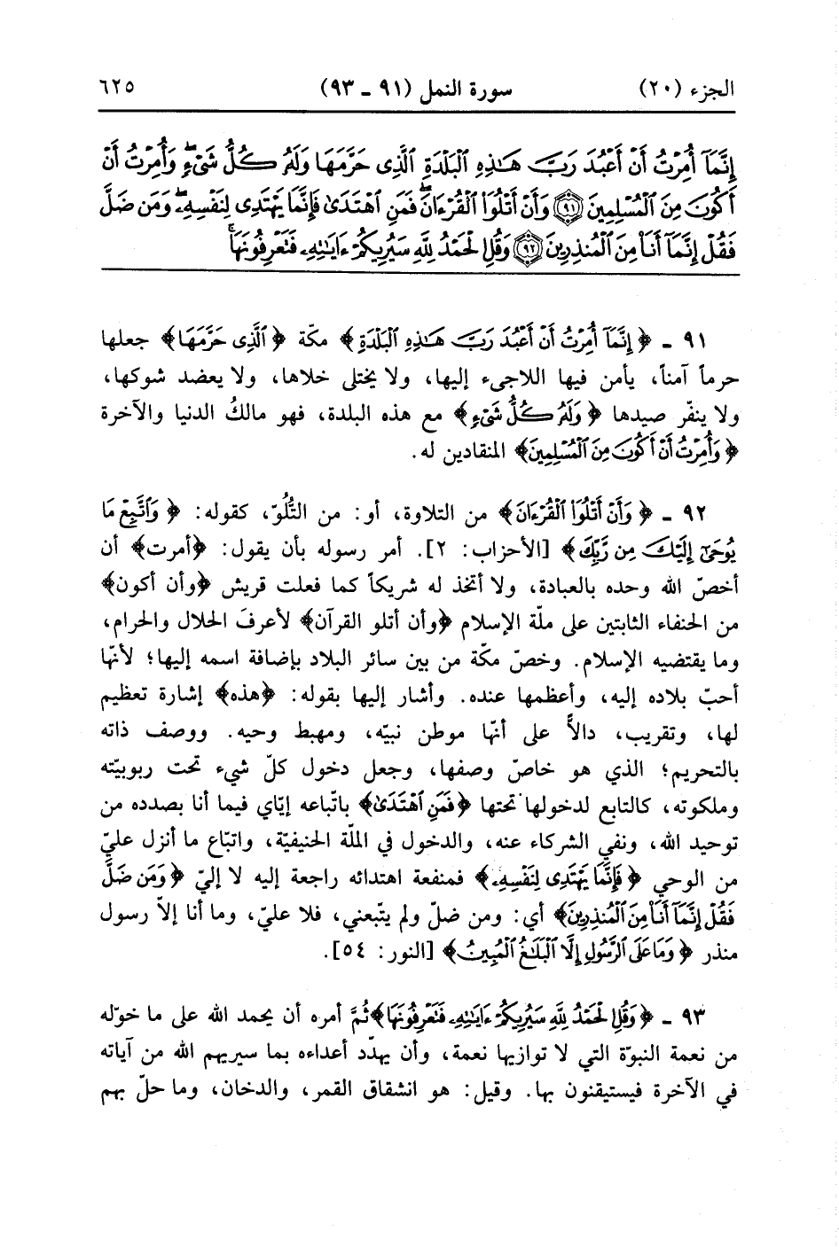إِنَّمَا أُمِرْتُ أَنْ أَعْبُدَ رَبَّ هَذِهِ الْبَلْدَةِ الَّذِي حَرَّمَهَا وَلَهُ كُلُّ شَيْءٍ وَأُمِرْتُ أَنْ أَكُونَ مِنَ الْمُسْلِمِينَ (91)