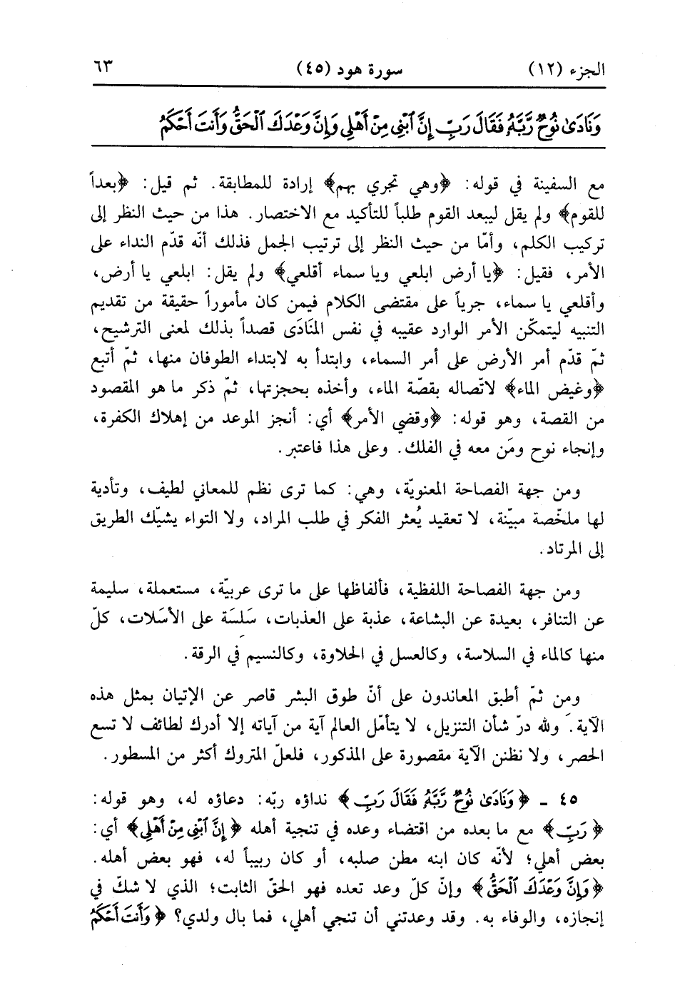 وَنَادَى نُوحٌ رَبَّهُ فَقَالَ رَبِّ إِنَّ ابْنِي مِنْ أَهْلِي وَإِنَّ وَعْدَكَ الْحَقُّ وَأَنْتَ أَحْكَمُ الْحَاكِمِينَ (45)