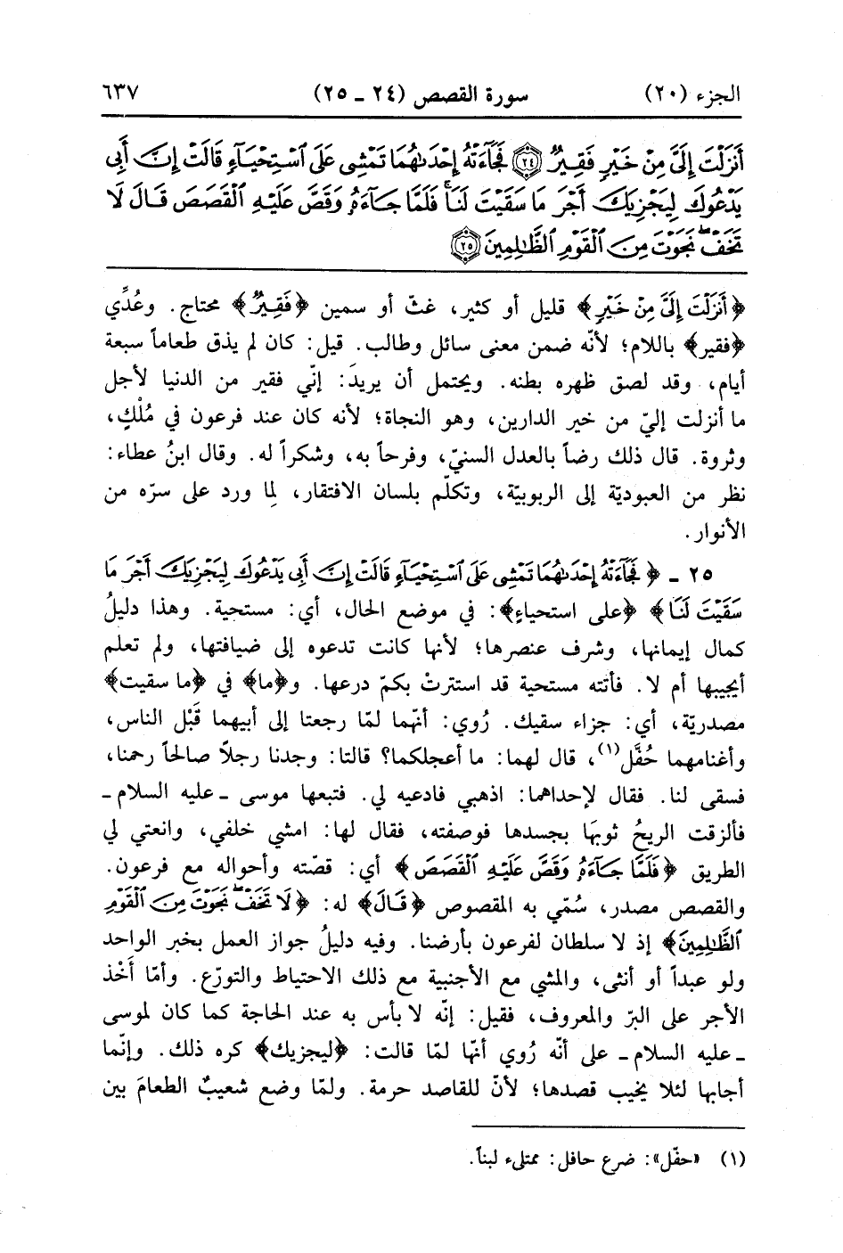فَجَاءَتْهُ إِحْدَاهُمَا تَمْشِي عَلَى اسْتِحْيَاءٍ قَالَتْ إِنَّ أَبِي يَدْعُوكَ لِيَجْزِيَكَ أَجْرَ مَا سَقَيْتَ لَنَا فَلَمَّا جَاءَهُ وَقَصَّ عَلَيْهِ الْقَصَصَ قَالَ لَا تَخَفْ نَجَوْتَ مِنَ الْقَوْمِ الظَّالِمِينَ (25)