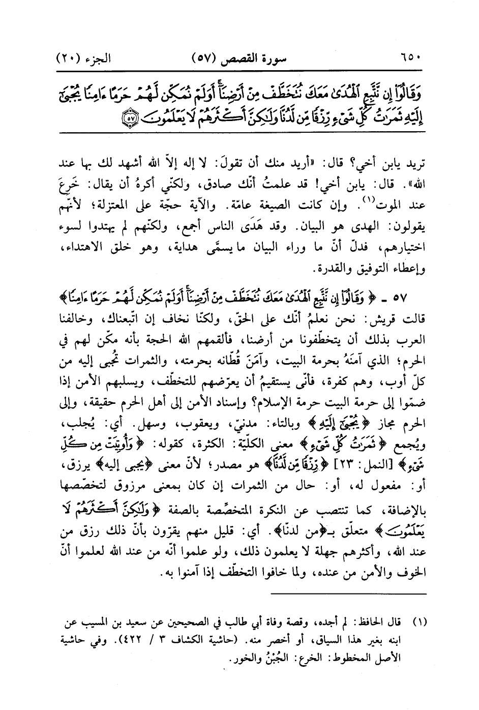 تريد يا بان أخي قال أريد منك أن تقول لا إله إلا الله أشهد لك بها عند الله قال يابن أخي أنا قد علمت أنك صادق ولكني أكره أن يقال جزع عند الموت وإن كانت الصيغة عامة والآية حجة على المعتزلة لأنهم يقولون الهدى هو البيان قد هدى الناس أجمع ولكنهم لم يهتدوا بسوء اختيارهم فدل أن رواء البيان ما يسمى هداية وهو خلق الاهتداء وإعطاء التوفيق والقدرة