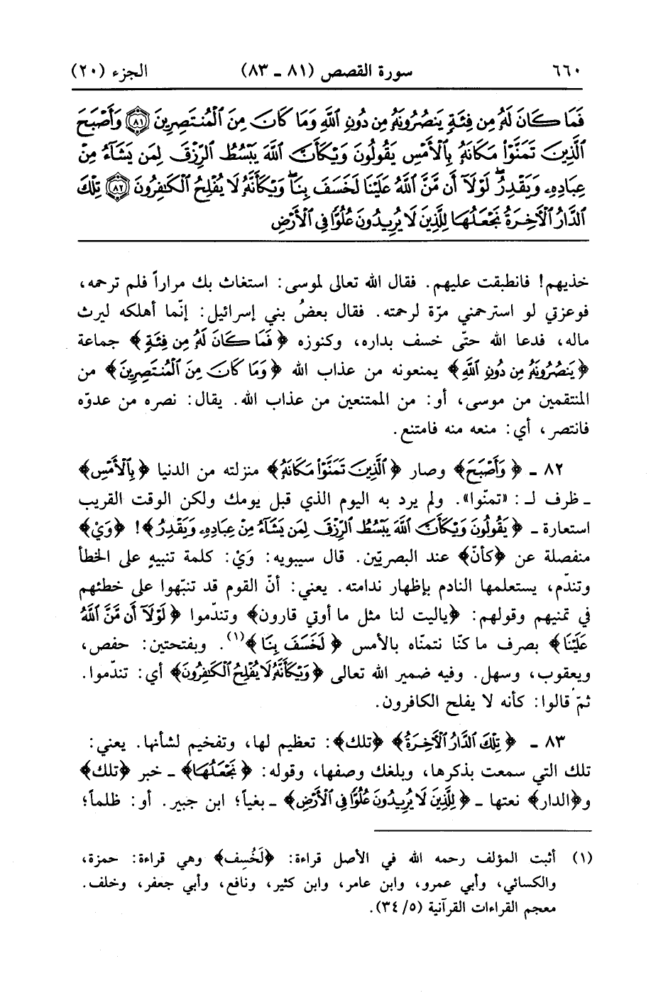 وَأَصْبَحَ الَّذِينَ تَمَنَّوْا مَكَانَهُ بِالْأَمْسِ يَقُولُونَ وَيْكَأَنَّ اللَّهَ يَبْسُطُ الرِّزْقَ لِمَنْ يَشَاءُ مِنْ عِبَادِهِ وَيَقْدِرُ لَوْلَا أَنْ مَنَّ اللَّهُ عَلَيْنَا لَخَسَفَ بِنَا وَيْكَأَنَّهُ لَا يُفْلِحُ الْكَافِرُونَ (82)