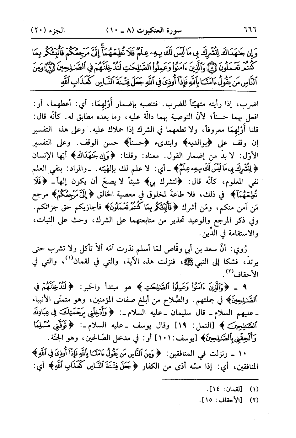 اضرب إذا رأيته متهيأ للضرب فتنصبه بإضمار أولهما أو افعل بهما لأن التوصية بهما دالة عليه وما بعده مطابق له كأنه قال قلنا أولهما معروفاً ولا تطعهما في الشرك إذا حملاك عليه وعلى هذا التفسيران وقف على بوالديه وابتدىء حسناً حسن الوقف على التفسير الأول لابد من إضمار القول معناه وقلنا {وَإِن جاهداك} أيها الإنسان {لِتُشْرِكَ بِى مَا لَيْسَ لَكَ به علم} أي لا علم بإلهيته والمراد بنفي العلم نفي المعلوم كأنه قال لتشرك بي شيئاً لا يصح أن يكون إلهاً {فَلاَ تُطِعْهُمَا} في ذلك فلا طاعة لمخلوق في معصية الخالق