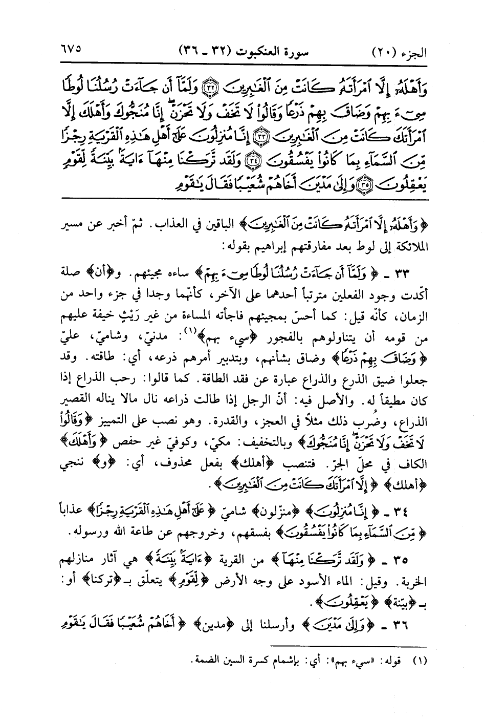 وَلَمَّا أَنْ جَاءَتْ رُسُلُنَا لُوطًا سِيءَ بِهِمْ وَضَاقَ بِهِمْ ذَرْعًا وَقَالُوا لَا تَخَفْ وَلَا تَحْزَنْ إِنَّا مُنَجُّوكَ وَأَهْلَكَ إِلَّا امْرَأَتَكَ كَانَتْ مِنَ الْغَابِرِينَ (33)