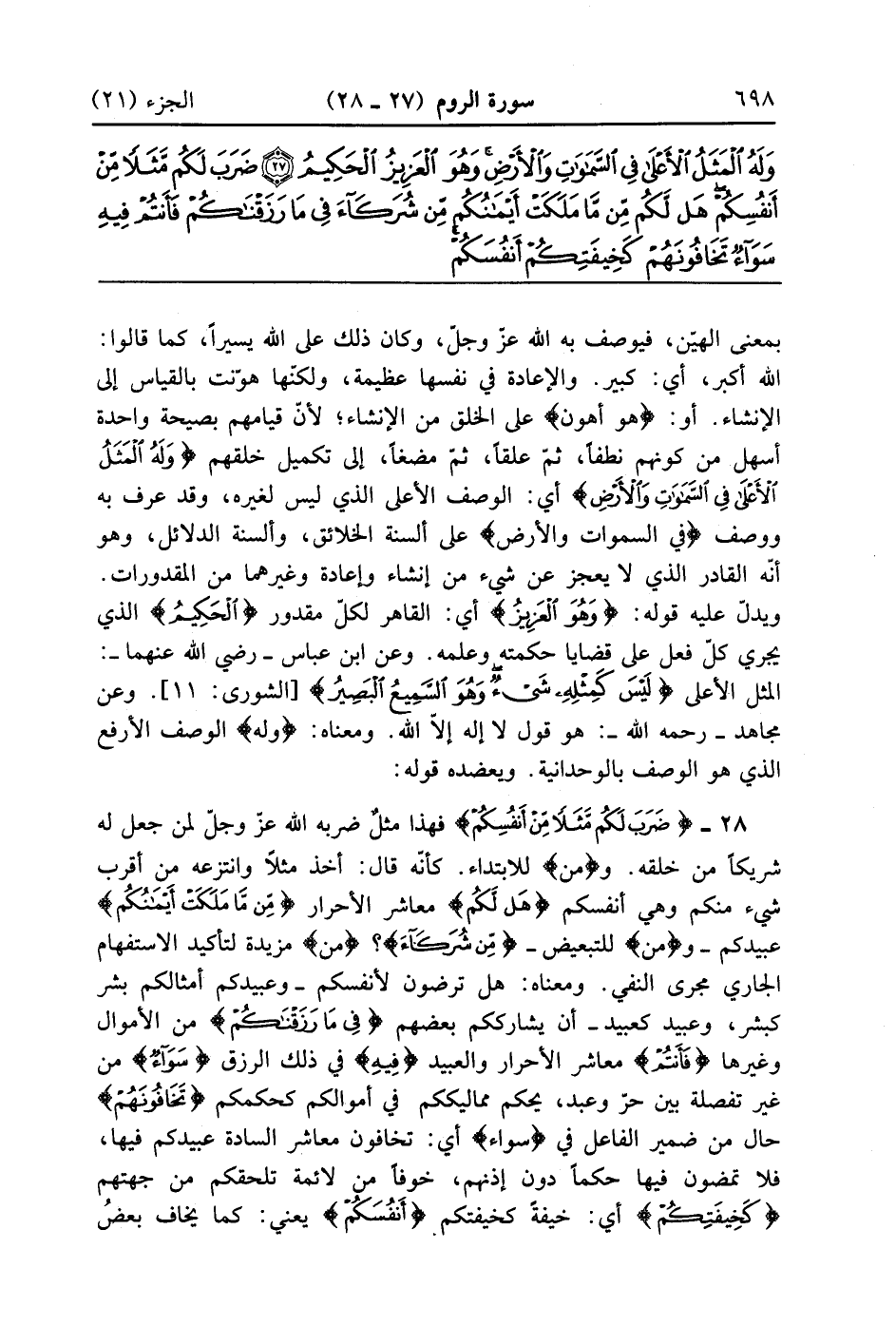 ضَرَبَ لَكُمْ مَثَلًا مِنْ أَنْفُسِكُمْ هَلْ لَكُمْ مِنْ مَا مَلَكَتْ أَيْمَانُكُمْ مِنْ شُرَكَاءَ فِي مَا رَزَقْنَاكُمْ فَأَنْتُمْ فِيهِ سَوَاءٌ تَخَافُونَهُمْ كَخِيفَتِكُمْ أَنْفُسَكُمْ كَذَلِكَ نُفَصِّلُ الْآيَاتِ لِقَوْمٍ يَعْقِلُونَ (28)