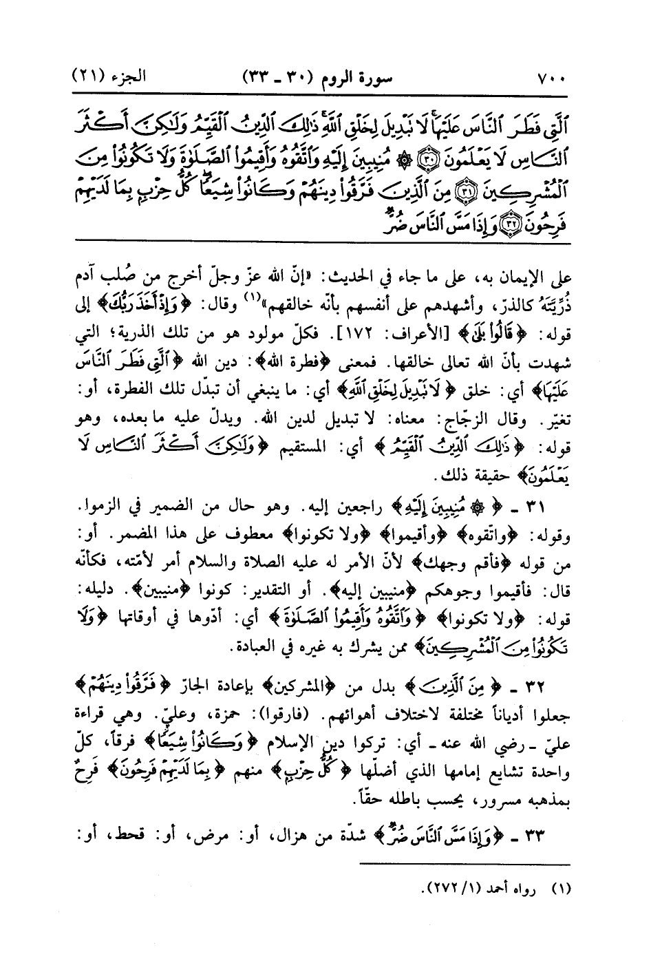 على الإيمان به على ما جاء فى الحديث ان الله عز وجل أخرج من صلب آدم كالدر وأشهدهم على أنفسهم بأنه خالقهم فقال وإذ أخذر بك إلى قوله قالوا بلى وكل مولود هو من تلك الذرية التي شهدت بأن الله تعالى خالقها فمعنى فطرة الله دين الله {التى فَطَرَ الناس عَلَيْهَا} أي خلق {لاَ تَبْدِيلَ لِخَلْقِ الله} أي ما ينبغي أن تبدل تلك الفطرة أو تغير وقال الزجاج معناه لا تبديل لدين الله ويدل عليه ما بعده وهو قوله {ذلك الدين القيم} أي المستقيم {ولكن أَكْثَرَ الناس لاَ يَعْلَمُونَ} حقيقة ذلك
