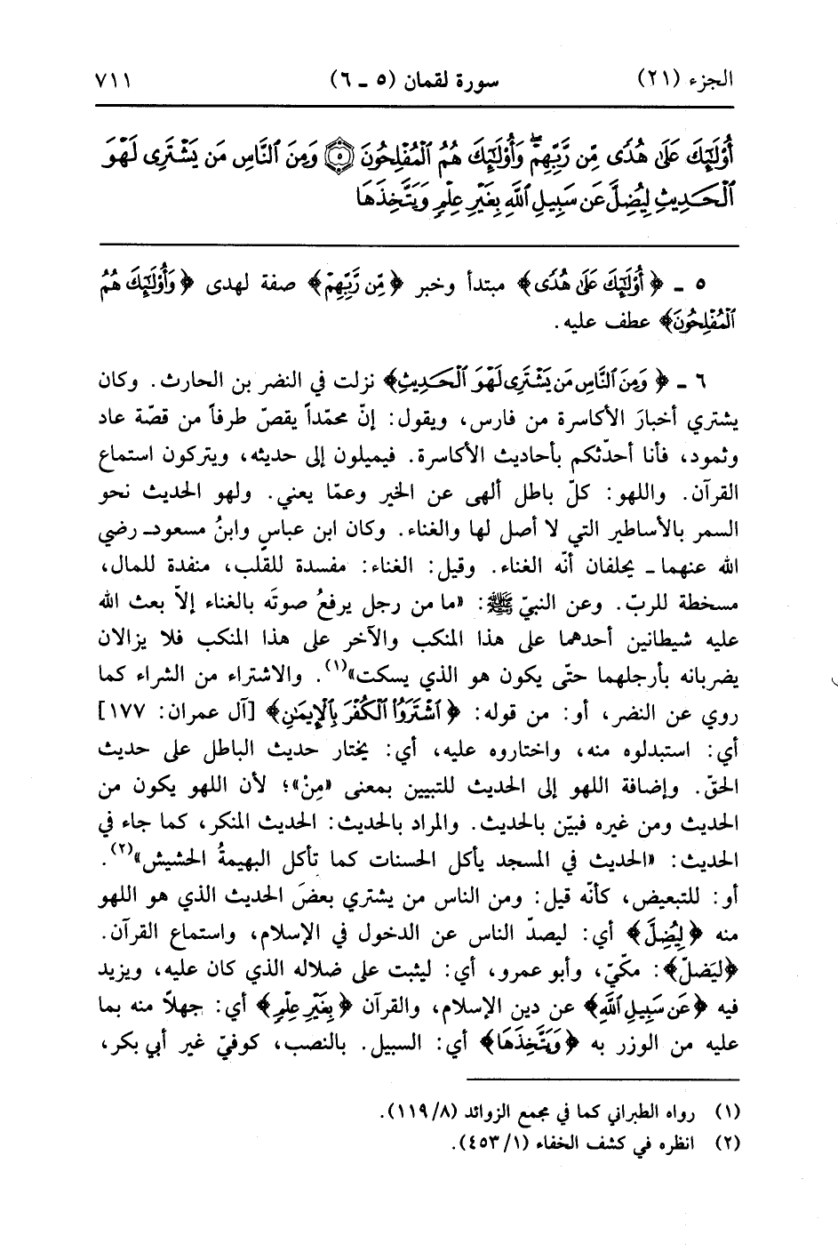 {وَمِنَ الناس مَن يَشْتَرِى لَهْوَ الحديث} نزلت في النضر بن الحرث وكان يشتري أخبار الا كاسرة من فارس ويقول إن محمداً يقص طرفاً من قصة عاد وثمود فأنا أحدثكم بأحاديث الا كاسرة فيميلون إلى حديثه ويتركون استماع القرآن واللهو كل باطل الهى عن الخيروعما يعني ولهو الحديث نحو السمر بالأساطير التي لا أصل لها والغناء وكان ابن مسعود وابن عباس رضي الله عنهما يحلفان أنه الغناء وقيل الغناء مفسدة للقلب منفذة للمال مسخطة للرب وعن النبي صلى الله عليه وسلم ما من رجل يرفع صوته بالغناء إلا بعث الله عليه شيطانين أحدهما على هذا المنكب والآخر على هذا المنكب فلا يزالان يضربانه بأرجلهما حتى يكون هو الذي يسكت والاشتراء من الشراء كما روي عن النضر أو من قوله اشتروا الكفر بالإيمان أي استبدلوه منه واختاروه عليه أي يختارون حديث الباطل على حديث الحق وإضافة اللهو إلى الحديث للتبيين بمعنى من لأن اللهو يكون من الحديث ومن غيره فبيّن بالحديث والمراد بالحديث الحديث المنكر كما جاء في الحديث الحديث في المسجد يأكل الحسنات كما تأكل البهيمة الحشيش أو للتبعيض كأنه قيل ومن الناس من يشتري بعض الحديث الذي هو اللهو منه {لِيُضِلَّ} أي ليصد الناس عن الدخول في الإسلام واستماع القرآن ليضَل مكي وأبو عمرو أي