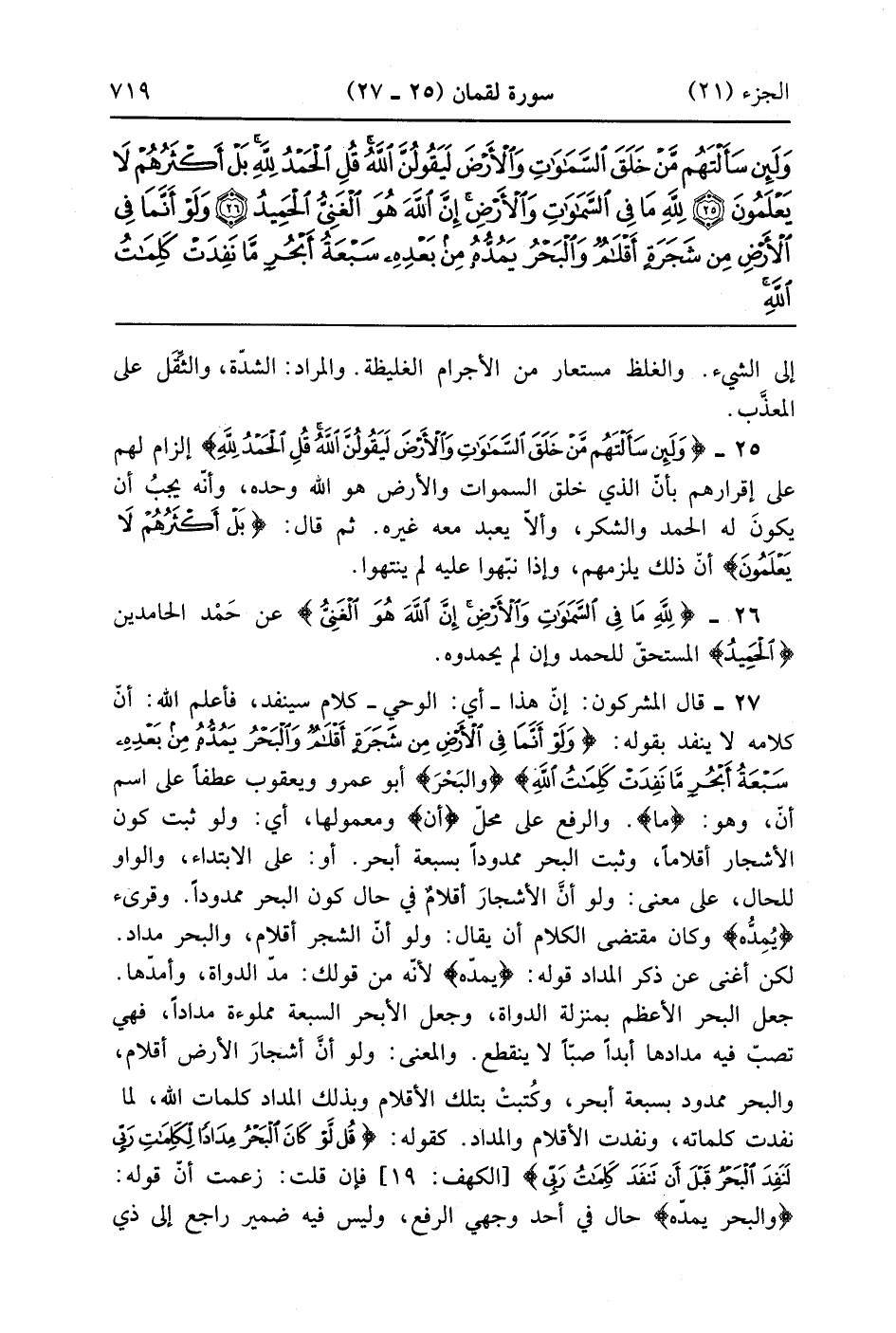 وَلَوْ أَنَّمَا فِي الْأَرْضِ مِنْ شَجَرَةٍ أَقْلَامٌ وَالْبَحْرُ يَمُدُّهُ مِنْ بَعْدِهِ سَبْعَةُ أَبْحُرٍ مَا نَفِدَتْ كَلِمَاتُ اللَّهِ إِنَّ اللَّهَ عَزِيزٌ حَكِيمٌ (27)