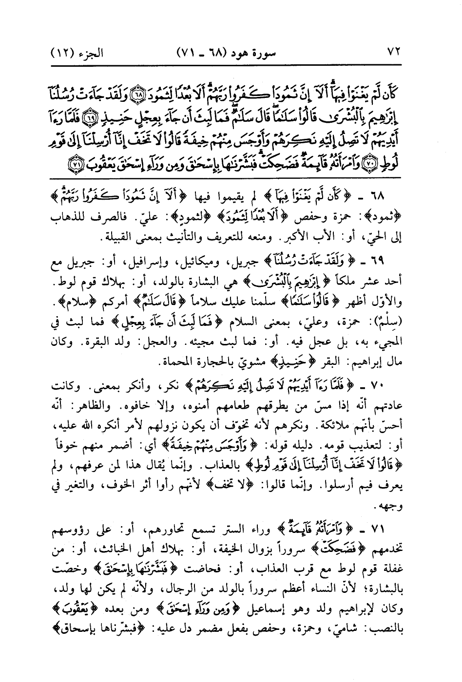 {وَلَقَدْ جَاءتْ رُسُلُنَا} جبريل وميكائيل وإسرافيل أو جبريل مع أحد عشر ملكاً {إبراهيم بالبشرى} هي البشارة بالولد أو بهلاك قوم لوط والأول أظهر {قَالُواْ سَلاَماً} سلمنا عليك سلاماً {قَالَ سلام} أمركم سلام سِلم حمزة وعلي بمعنى السلام {فَمَا لَبِثَ أَن جَاء بِعِجْلٍ} فما لبث فى المجئ به بل عجل فيه أو فما لبث مجيئه والعجل ولد البقرة وكان مال إبراهيم البقر {حنيذ} مشوى بالحجارة المحماة