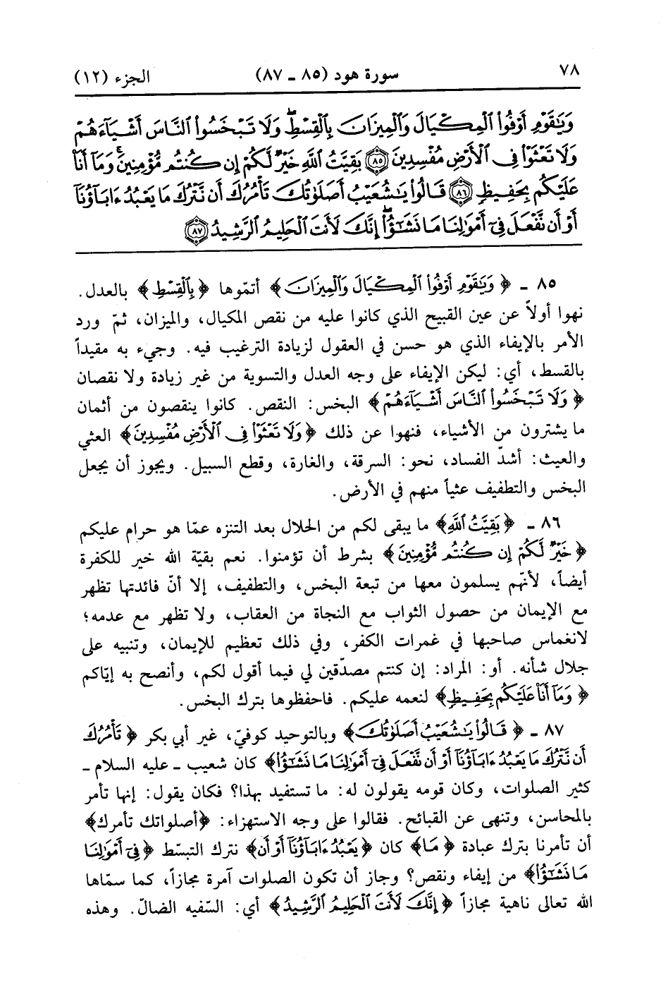 وَيَا قَوْمِ أَوْفُوا الْمِكْيَالَ وَالْمِيزَانَ بِالْقِسْطِ وَلَا تَبْخَسُوا النَّاسَ أَشْيَاءَهُمْ وَلَا تَعْثَوْا فِي الْأَرْضِ مُفْسِدِينَ (85)
