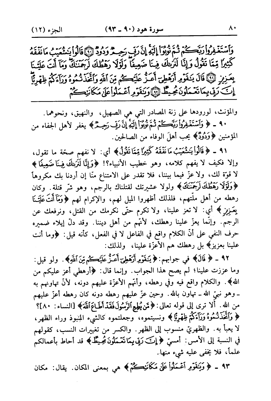 قَالُوا يَا شُعَيْبُ مَا نَفْقَهُ كَثِيرًا مِمَّا تَقُولُ وَإِنَّا لَنَرَاكَ فِينَا ضَعِيفًا وَلَوْلَا رَهْطُكَ لَرَجَمْنَاكَ وَمَا أَنْتَ عَلَيْنَا بِعَزِيزٍ (91)