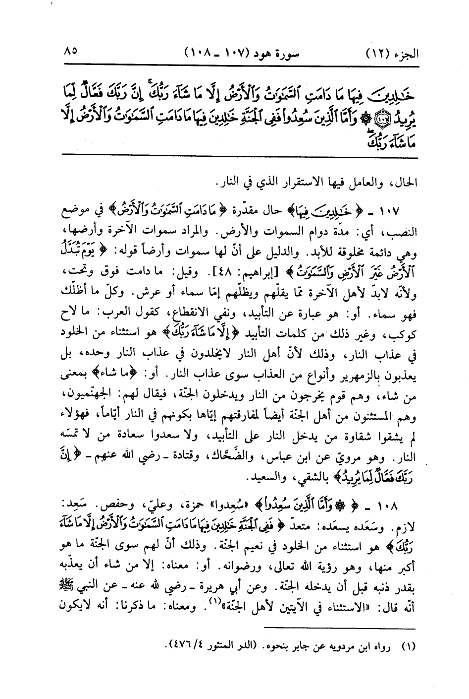 وَأَمَّا الَّذِينَ سُعِدُوا فَفِي الْجَنَّةِ خَالِدِينَ فِيهَا مَا دَامَتِ السَّمَاوَاتُ وَالْأَرْضُ إِلَّا مَا شَاءَ رَبُّكَ عَطَاءً غَيْرَ مَجْذُوذٍ (108)