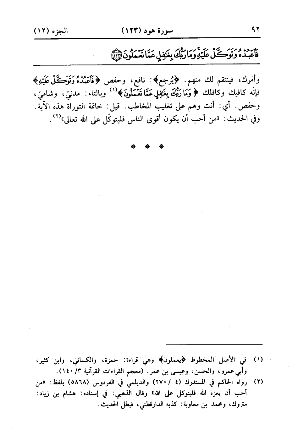 وأمرك فينتقم لك منهم يُرجع نافع وحفص {فاعبده وَتَوَكَّلْ عَلَيْهِ} فإنه كافيك وكافلك {وَمَا رَبُّكَ بغافل عَمَّا يعملون} وبالتاء مدني وشامي وحفص أي أنت وهم على تغليب المخاطب قيل خاتمة التوراة هذه الآية وفي الحديث من أحب أن يكون أقوى الناس فليتوكل على الله تعالى