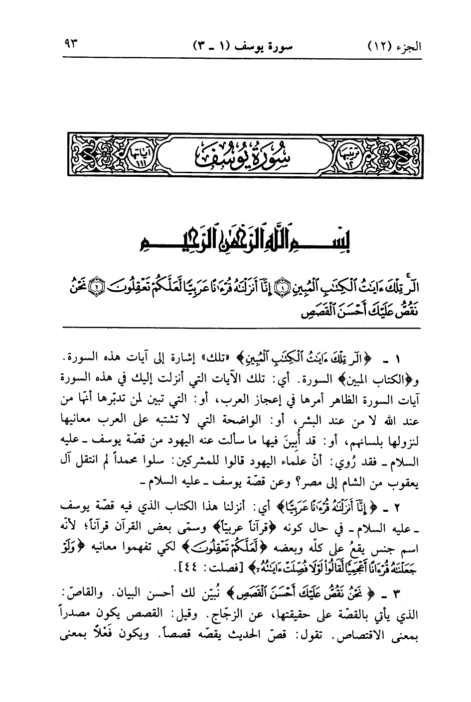 {الر تلك آيات الكتاب المبين} تلك اشاة ر إلى آيات هذه الصورة والكتاب المبين السورة أي تلك الآيات التي أنزلت إليك في هذه السورة آيات السورة الظاهر أمرها في إعجاز العرب أو التي تبين لمن تدبَّرها أنها من عند الله لا من عند البشر أو الواضحة التي لا تشتبه على العرب معانيها لنزولها بلسانهم أو قد أبيِّن فيها ما سألت عنه اليهود من قصة يوسف عليه السلام فقد رُوي أن علماء اليهود قالوا للمشريكن سلوا محمد لم انتقل آل يعقوب من الشام إلى مصر وعن قصة يوسف عليه السلام