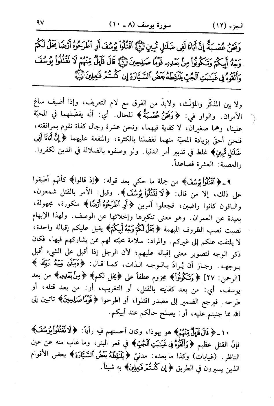قَالَ قَائِلٌ مِنْهُمْ لَا تَقْتُلُوا يُوسُفَ وَأَلْقُوهُ فِي غَيَابَتِ الْجُبِّ يَلْتَقِطْهُ بَعْضُ السَّيَّارَةِ إِنْ كُنْتُمْ فَاعِلِينَ (10)