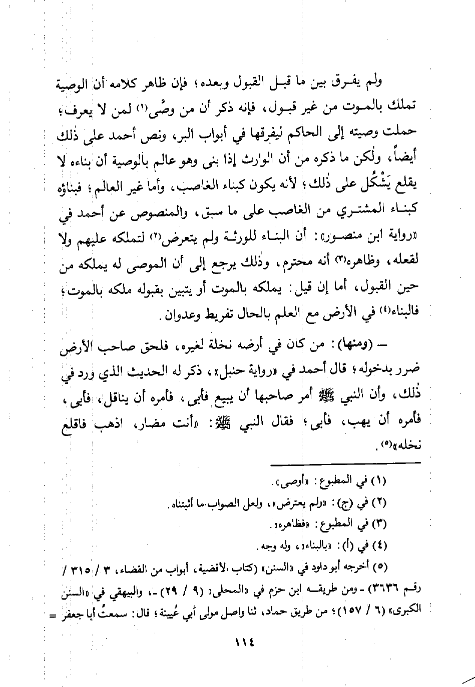 - (ومنها): من كان في أرضه نخلة لغيره، فلحق صاحب الأرض ضرر بدخوله؛ قال أحمد في "رواية حنبل"، ذكر له الحديث الذي ورد في ذلك، وأن النبي -صلى اللَّه عليه وسلم- أمر صاحبها أن يبيع فأبى، فأمره أن يناقل، فأبى، فأمره أن يهب، فأبى؛ فقال النبي -صلى اللَّه عليه وسلم-: "أنت مضار، اذهب فاقلع نخله" (¬5).
