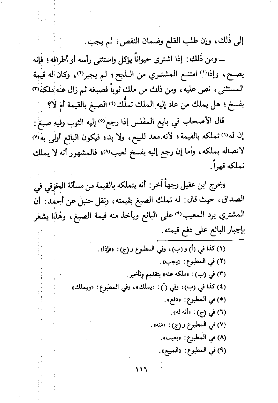 - ومن ذلك: إذا اشترى حيوانًا يؤكل واستثنى رأسه أو أطرافه؛ فإنه يصح، وإذا (¬1) امتنع المشتري من الذبح؛ لم يجبر (¬2)، وكان له قيمة المستثنى، نص عليه، ومن ذلك من ملك ثوبًا فصبغه ثم زال عنه ملكه (¬3) بفسخ؛ هل يملك من عاد إليه الملك تملُّك (¬4) الصبغ بالقيمة أم لا؟