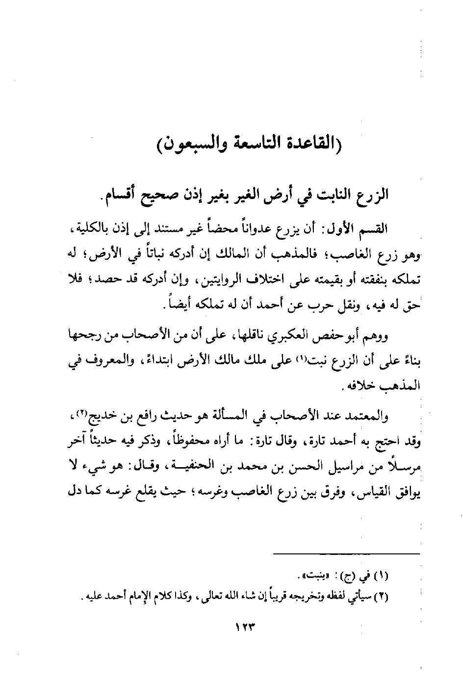 والمعتمد عند الأصحاب في المسألة هو حديث رافع بن خديج (¬2)، وقد احتج به أحمد تارة، وقال تارة: ما أراه محفوظًا، وذكر فيه حديثًا آخر مرسلًا من مراسيل الحسن بن محمد بن الحنفية، وقال: هو شيء لا يوافق القياس، وفرق بين زرع الغاصب وغرسه؛ حيث يقلع غرسه كما دل