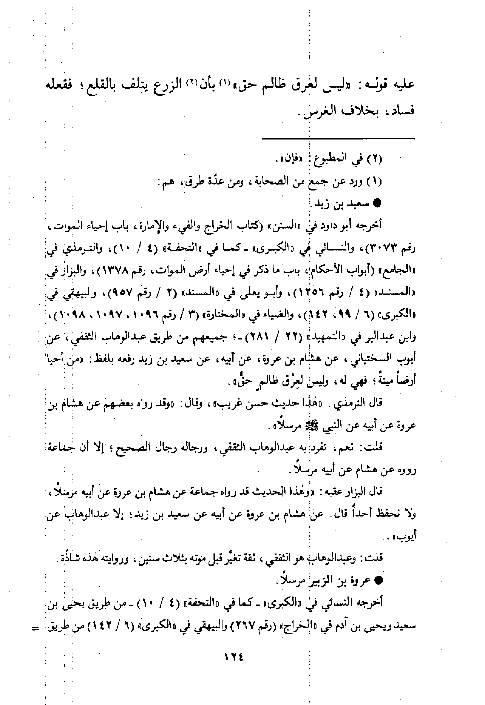 أخرجه أبو داود في "السنن" (كتاب الخراج والفيء والإمارة، باب إحياء الموات، رقم 3073)، والنسائي في "الكبرى" -كما في "التحفة" (4/ 10)، والترمذي في "الجامع" (أبواب الأحكام، باب ما ذكر في إحياء أرض الموات، رقم 1378)، والبزار في "المسند" (4/ رقم 1256)، وأبو يعلى في "المسند" (2/ رقم 957)، والبيهقي في "الكبرى" (6/ 99، 142)، والضياء في "المختارة" (3/ رقم 1096، 1097، 1098)، وابن عبد البر في "التمهيد" (22/ 281) -؛ جميعهم من طربق عبد الوهاب الثقفي، عن أبوب السختياني، عن هشام بن عروة، عن أبيه، عن سعيد بن زيد رفعه بلفظ: "من أحيا أرضًا ميتةً؛ فهي له، وليس لعِرْق ظالمٍ حقٌّ".