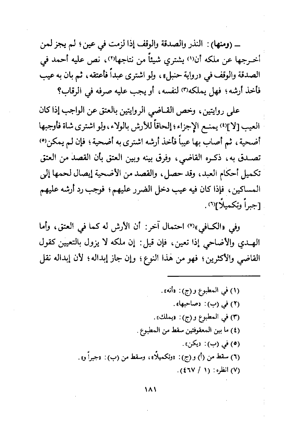 - (ومنها): النذر والصدقة والوقف إذا لزمت في عين؛ لم يجر لمن أخرجها عن ملكه أن (¬1) يشري شيئًا من نتاجها (¬2)، نص عليه أحمد في الصدقة والوقف في "رواية حنبل"، ولو اشترى عبدًا فأعتقه، ثم بأن به عيب فأخذ أرشه؛ فهل يملكه (¬3) لنفسه، أو يجب عليه صرفه في الرقاب؟