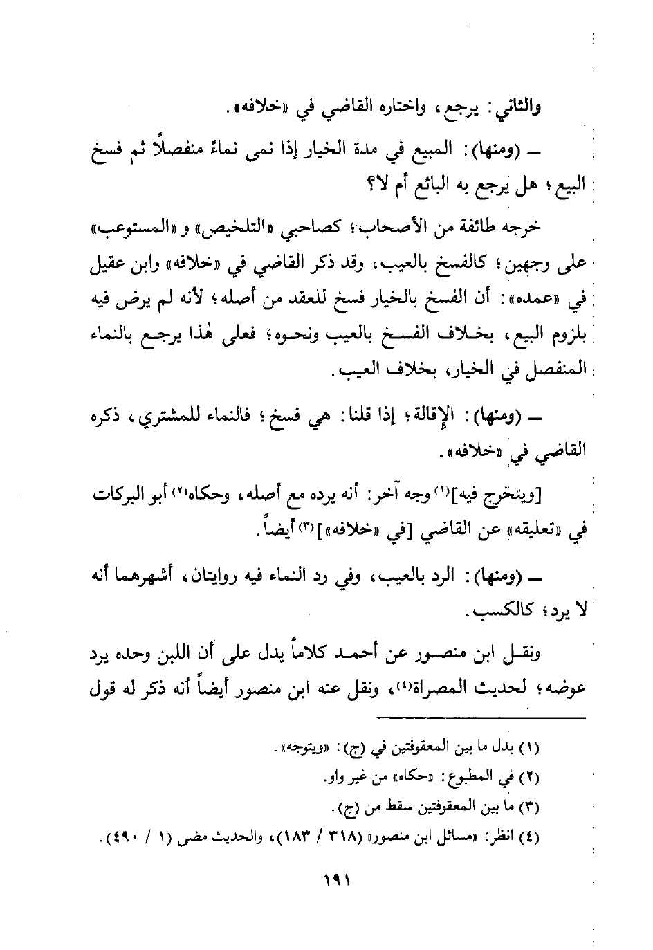 - (ومنها): الرد بالعيب، وفي رد النماء فيه روايتان، أشهرهما أنه لا يرد؛ كالكسب.