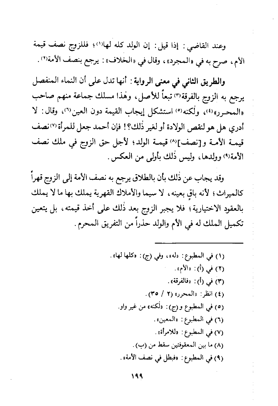 والطريق الثاني في معنى الرواية: أنها تدل على أن النماء المنفصل يرجع به الزوج بالفرقة (¬3) تبعًا للأصل، وهذا مسلك جماعة منهم صاحب "المحرر" (¬4)، ولكنه (¬5) استشكل إيجاب القيمة دون العين (¬6)، وقال: لا أدري هل هو لنقص الولادة أو لغير ذلك؟! فإن أحمد جعل للمرأة (¬7) نصف قيمة الأمة و [نصف] (¬8) قيمة الولد؛ لأجل حق الزوج في ملك نصف الأمة (¬9) وولدها، وليس ذلك بأولى من العكس.