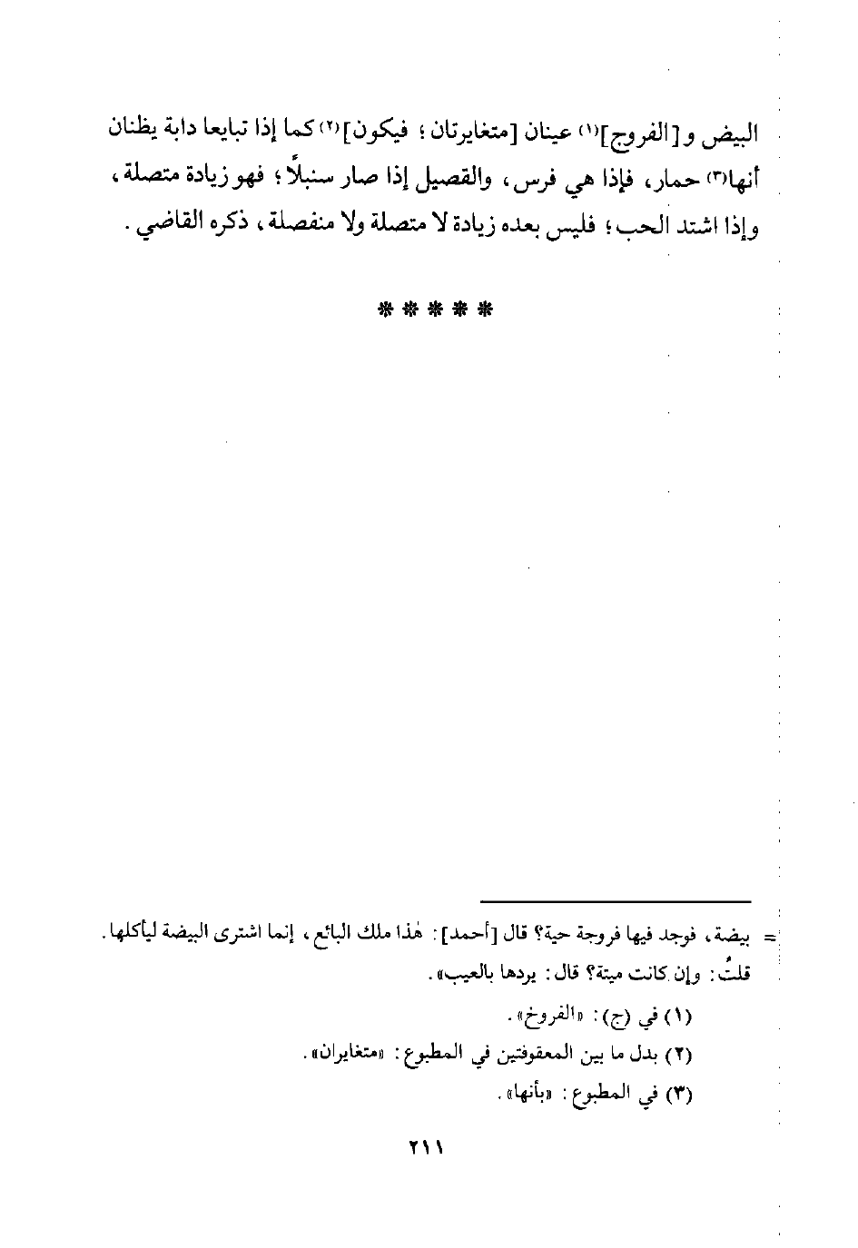 = بيضة، فوجد فيها فروجة حية؟ قال [أحمد]: هذا ملك البائع، إنما اشترى البيضة ليأكلها. قلتُ: وإن كانت ميتة؟ قال: يردها بالعيب".