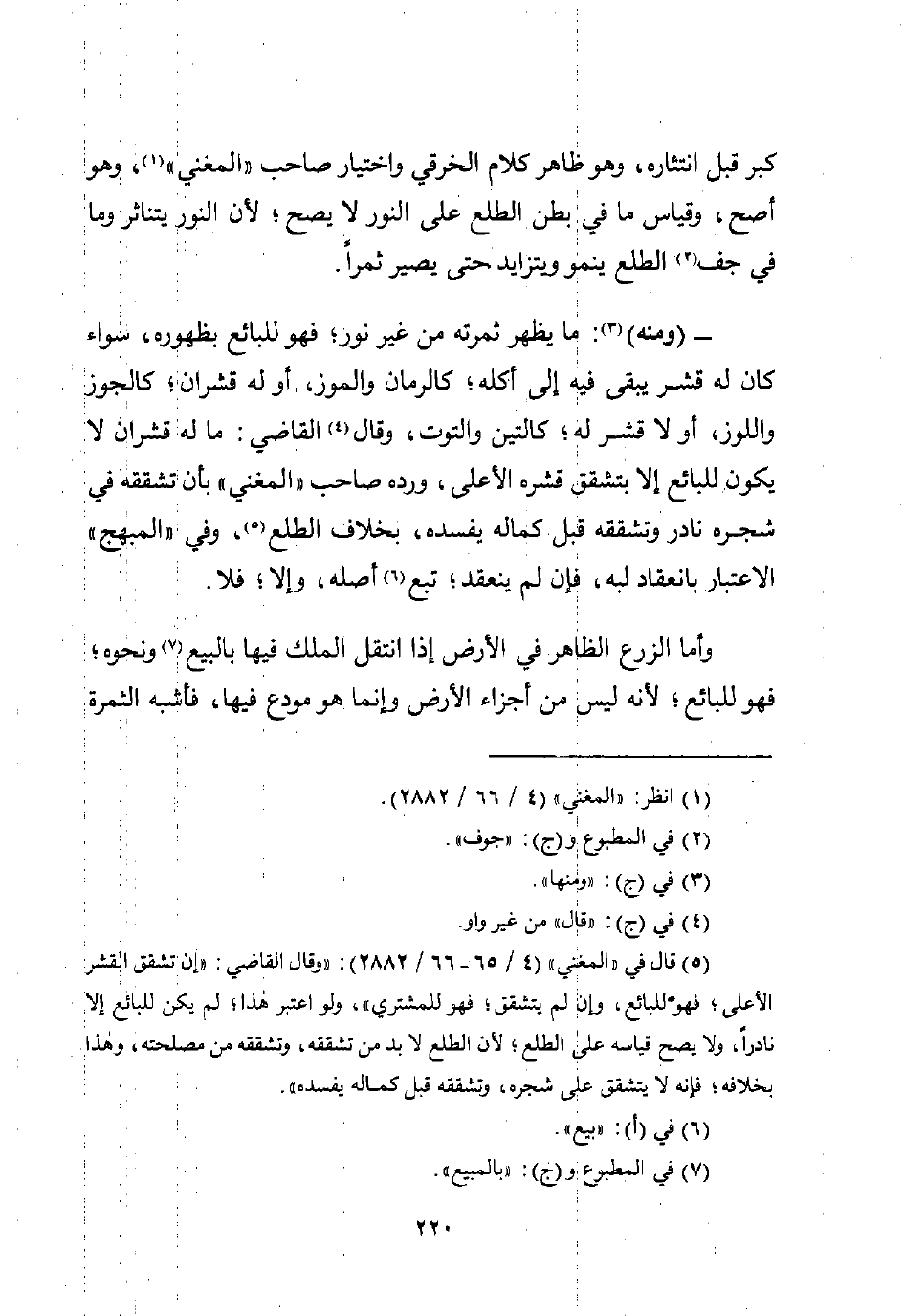 (¬5) قال في "المغني" (4/ 65 - 66/ 2882): "وقال القاضي: "إن تشقق القشر الأعلى؛ فهو للبائع، وإن لم يتشقق؛ فهو للمشتري"، ولو اعتبر هذا؛ لم يكن للبائع إلا نادرًا، ولا يصح قياسه على الطلع؛ لأن الطلع لا بد من تشققه، وتشققه من مصلحته، وهذا بخلافه؛ فإنه لا يتشقق على شجره، وتشققه قبل كماله يفسده".