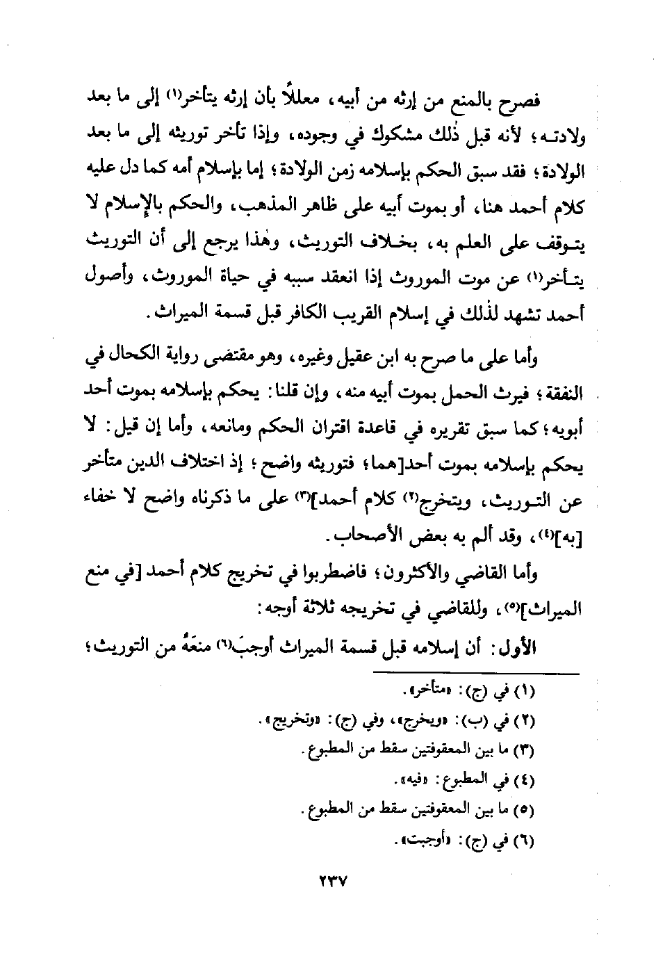 فصرح بالمنع من إرثه من أبيه، معللًا بان إرثه يتأخر (¬1) إلى ما بعد ولادته؛ لأنه قبل ذلك مشكوك في وجوده، وإذا تأخر توريثه إلى ما بعد الولادة؛ فقد سبق الحكم بإسلامه زمن الولادة؛ إما بإسلام أمه كما دل عليه كلام أحمد هنا، أو بموت أبيه على ظاهر المذهب، والحكم بالإسلام لا يتوقف على العلم به، بخلاف التوريث، وهذا يرجع إلى أن التوريث يتأخر (1) عن موت الموروث إذا انعقد سببه في حياة الموروث، وأصول أحمد تشهد لذلك في إسلام القريب الكافر قبل قسمة الميراث.