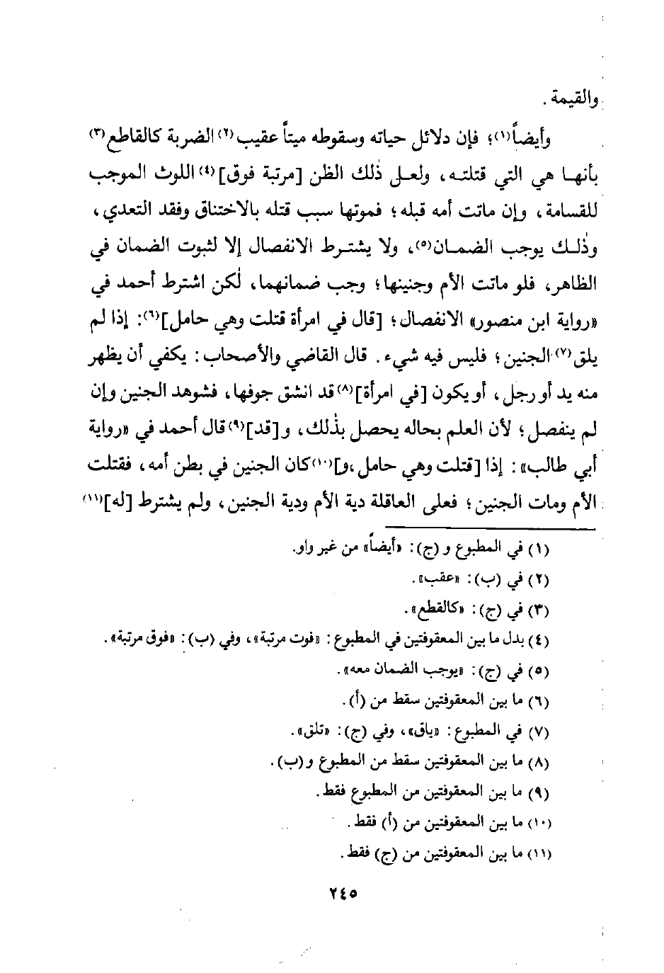 وأيضًا (¬1)؛ فإن دلائل حياته وسقوطه ميتًا عقيب (¬2) الضربة كالقاطع (¬3) بأنها هي التي قتلته، ولعك ذلك الظن [مرتبة فوق] (¬4) اللوث الموجب للقسامة، وإن ماتت أمه قبله؛ فموتها سبب قتله بالاختناق وفقد التعدي، وذلك يوجب الضمان (¬5)، ولا يشترط الانفصال إلا لثبوت الضمان في الظاهر، فلو ماتت الأم وجنينها؛ وجب ضمانهما، لكن اشترط أحمد في "رواية ابن منصور" الانفصال؛ [قال في امرأة قتلت وهي حامل] (¬6): إذا لم يلق (¬7) الجنين؛ فليس فيه شيء. قال القاضي والأصحاب: يكفي أن يظهر منه يد أو رجل، أو يكون [في امرأة] (¬8) قد انشق جوفها، فشوهد الجنين وإن لم ينفصل؛ لأن العلم بحاله يحصل بذلك، و [قد] (¬9) قال أحمد في "رواية أبي طالب": إذا [قتلت وهي حامل، و] (¬10) كان الجنين في بطن أمه، فقتلت الأم ومات الجنين؛ فعلى العاقلة دية الأم ودية الجنين، ولم يشترط [له] (¬11)