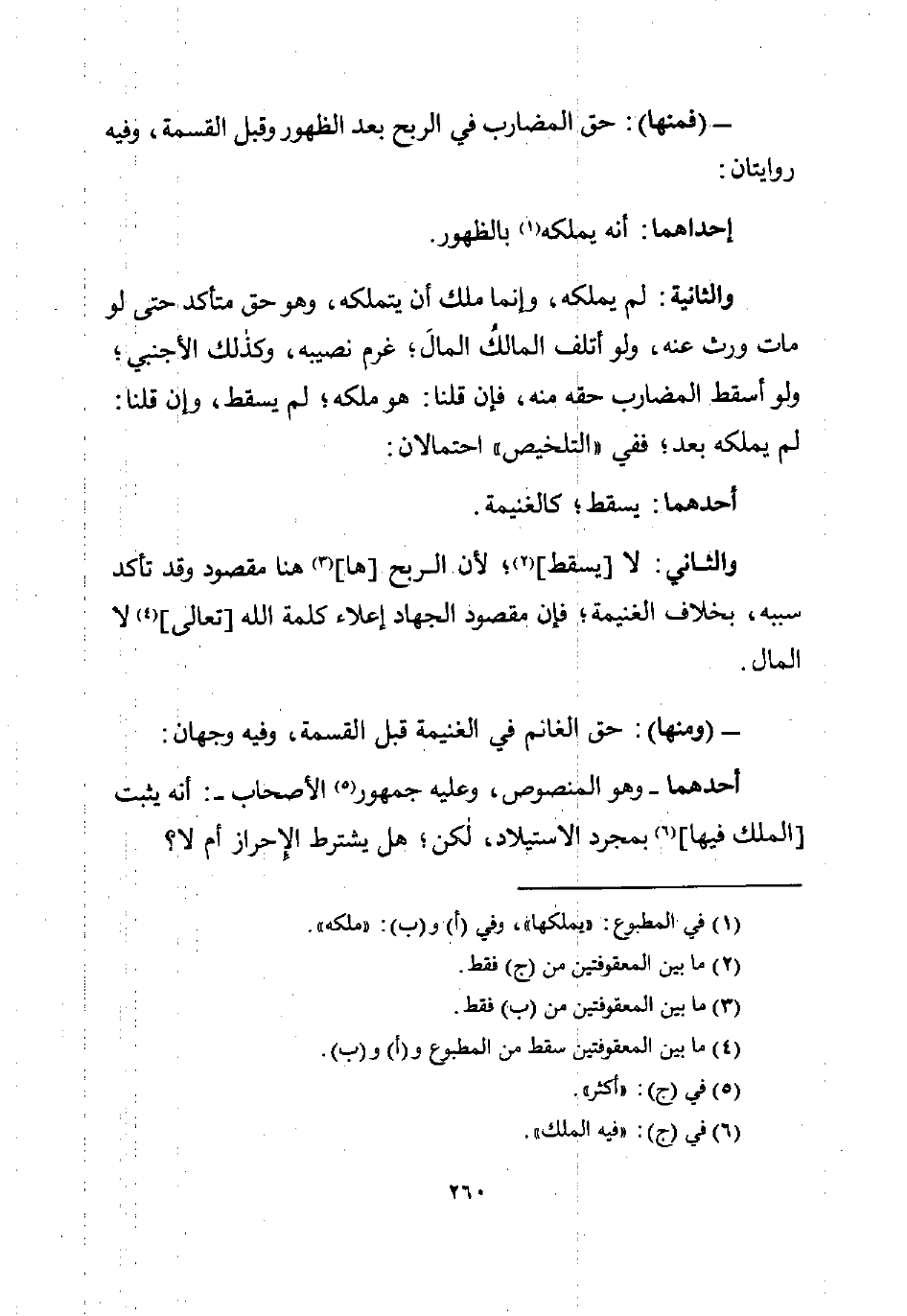 - (فمنها): حق المضارب في الربح بعد الظهور وقبل القسمة، وفيه روايتان: