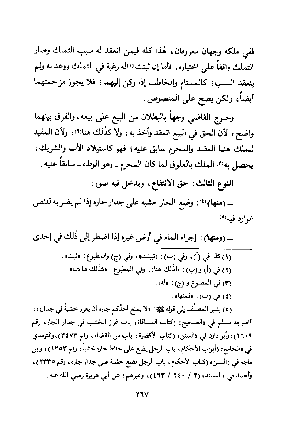 (¬5) يشير المصنِّف إلى قوله -صلى اللَّه عليه وسلم-: "لا يمنع أحدُكم جاره أن بغرز خشبةً في جداره"، أخرجه مسلم في "الصحيح" (كتاب المساقاة، باب غرز الخشب في جدار الجار، رقم 1609)، وأبو داود في "السنن" (كتاب الأقضية، باب من القضاء، رقم 3473)، والترمذي في "الجامع" (أبواب الأحكام، باب الرجل يضع على حائط جاره خشبًا، رقم 1353)، وابن ماجه في "السنن" (كتاب الأحكام، باب الرجل بضع خشبة على جدار جاره، رقم 2335)، وأحمد في "المسند" (2/ 240/ 463)، وغيرهم؛ عن أبي هريرة رضي اللَّه عنه.